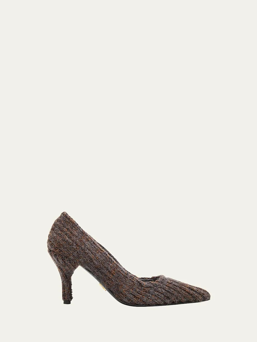 These pumps by Prada are crafted from a textural knitted upper atop a comfortable mid heel 3.25 in / 85 mm covered stiletto heel Pointed open toe Slipon style Rubber outsole Lining: Leather Professional cleaning recommended Made in Italy