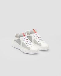 The iconic design of Prada America's Cup combines timeless lines and innovative materials. Cotton laces and an optical patterned tread enhance the product decorated with the Prada Linea Rossa logo badge. - Product code: 3E6420_ASZ_F0J36_F_B025 - Technical fabric lining - Prada Linea Rossa latex logo badge - Flat cotton laces - 25 mm rubber sole - Tread with optical pattern - Removable leather-lined insole - Imported MATERIALS Main material: Calfskin