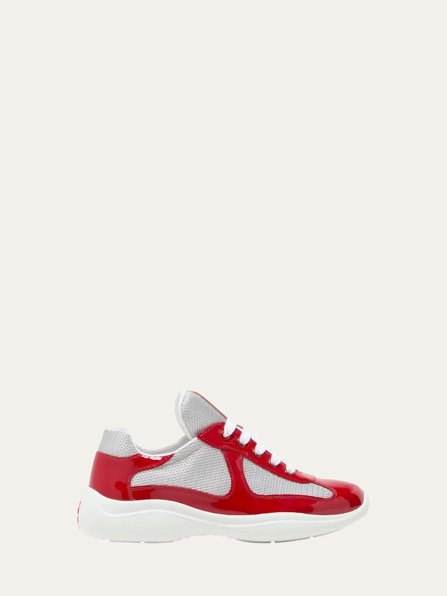 Prada "Vernice" patent calf leather and nylon mesh fabric runner sneakers 1.00 in / 25 mm flat heel Round toe Contrast logo on tongue Lace-up vamp Lining: Leather Rubber outsole Made in Italy Online Inquiries: BGS21_X66L7| Store Inquiries: #4590124