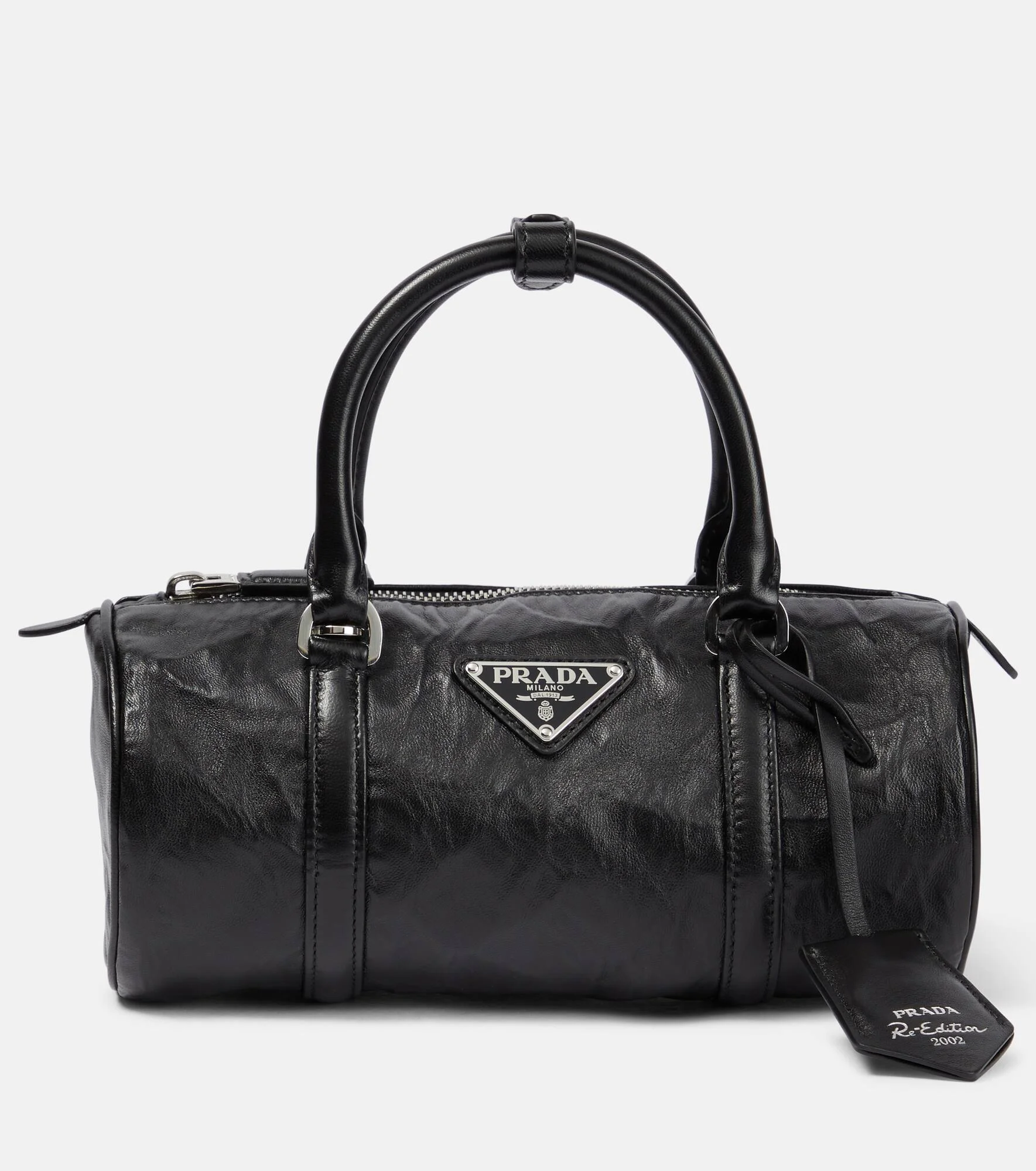A re-edition of a 2001 icon, Prada’s Antique tote bag is made in Italy from supple nappa leather with a handmade wrinkled effect. Shaped with top handles and a detachable shoulder strap, it’s topped with the brand-signature triangular emblem. Product Details - Closure: zipped top - Detachable, adjustable shoulder strap - Designer color name: Nero - Made in Italy - Material: leather - Detachable pouch - Trim: leather - Item number: P00779127 Size & Fit - Height 10,5cm-4" - Width 23cm-9" - Diameter 10,5cm-4" - Length of handles 26cm-10" - Min. length shoulder strap 111cm-43.5" - Max. length shoulder strap 117cm-46"