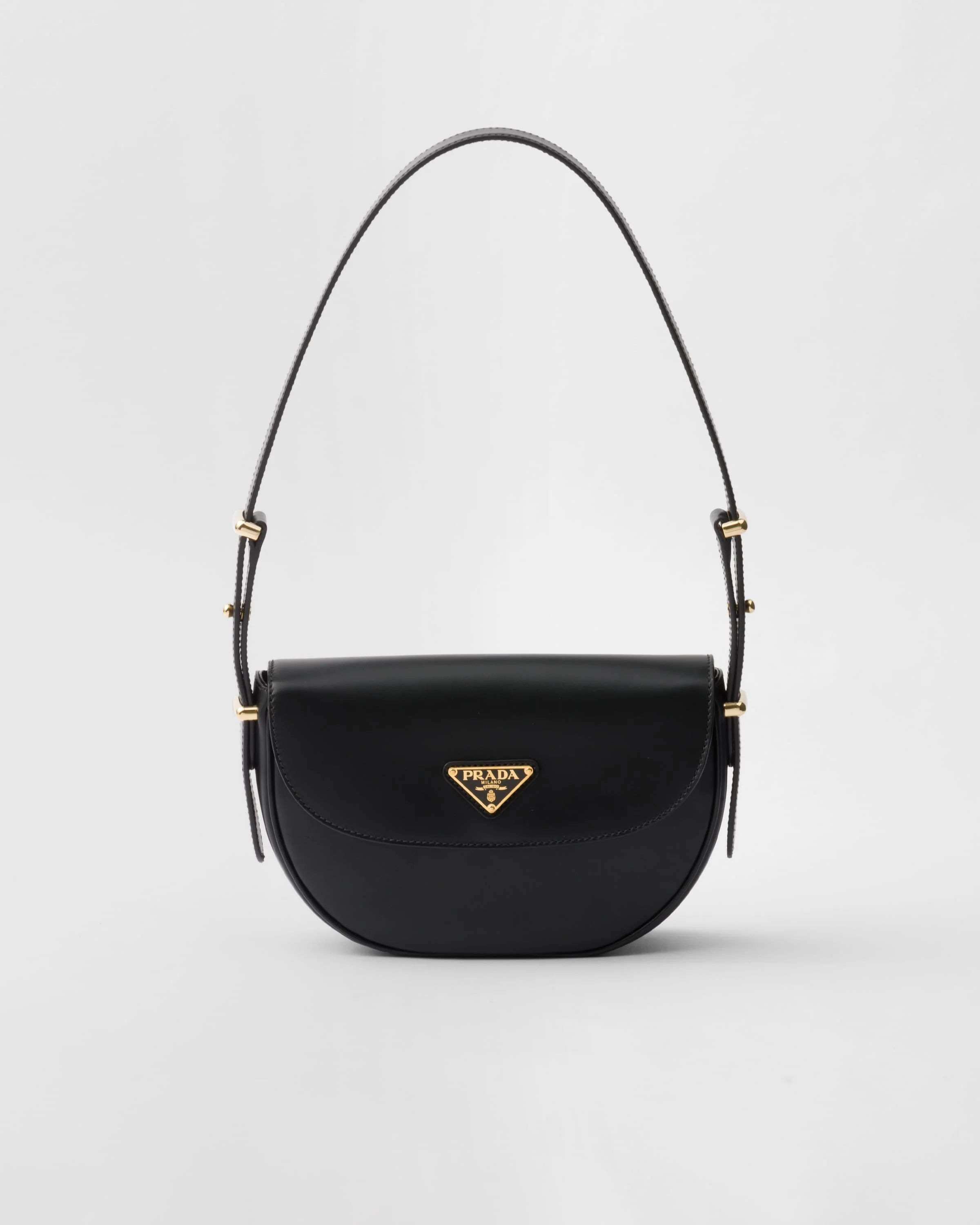 This refined and versatile leather bag features a sleek and compact design with structured volumes. To be worn over the shoulder or as a crossbody thanks to the elegant adjustable handle, the accessory with flap and nappa interior is defined by essential but refined details, an expression of the brand's artisanal know-how. The contemporary design is brightened by shiny metal hardware and is decorated with the iconic enameled metal triangle logo. - Product code: 1BD365_ASK_F0002_V_HVO - Leather handle with extension for cross-body use - Extendible shoulder strap Maximum length 122 cm - Minimum length 56 cm - Maximum drop 56 cm - Minimum drop 23 cm - Metal hardware - Enameled metal triangle logo on the flap - Magnetic closure on the flap - Nappa leather interior with patch pocket - Imported Height: 12cm Width: 23cm Length: 6cm MATERIALS Main material: Calfskin