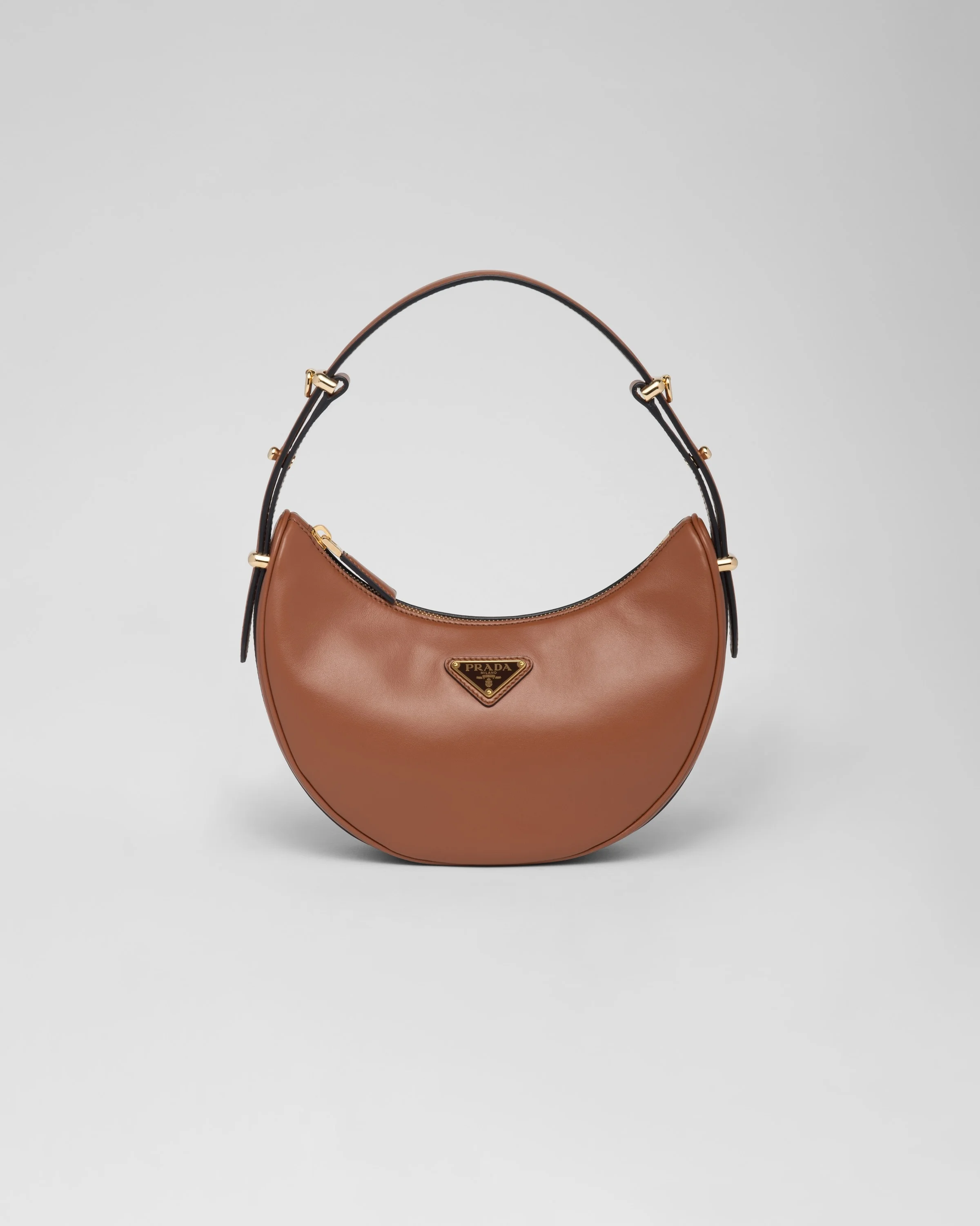 This sleek leather bag has a versatile, modernist allure. The accessory with a sinuous silhouette is completed by the leather extension and detachable shoulder strap for wearing different ways. The bag with nappa leather interior and metal hardware is embellished with the enameled metal triangle logo on the front. - Product code: 1BC194_ASK_F0XUG_V_OOO - Detachable, adjustable leather handle - Detachable, adjustable leather shoulder strap. Max. length: 93 cm - Min. length: 83 cm - Max. drop length: 60 cm - Min. drop length: 55 cm - Metal hardware - Enameled metal triangle logo on the front - Zipper closure - Nappa leather interior with patch pocket - Imported Height: 18.5cm Width: 22.5cm Length: 6cm MATERIALS Main material: Calfskin