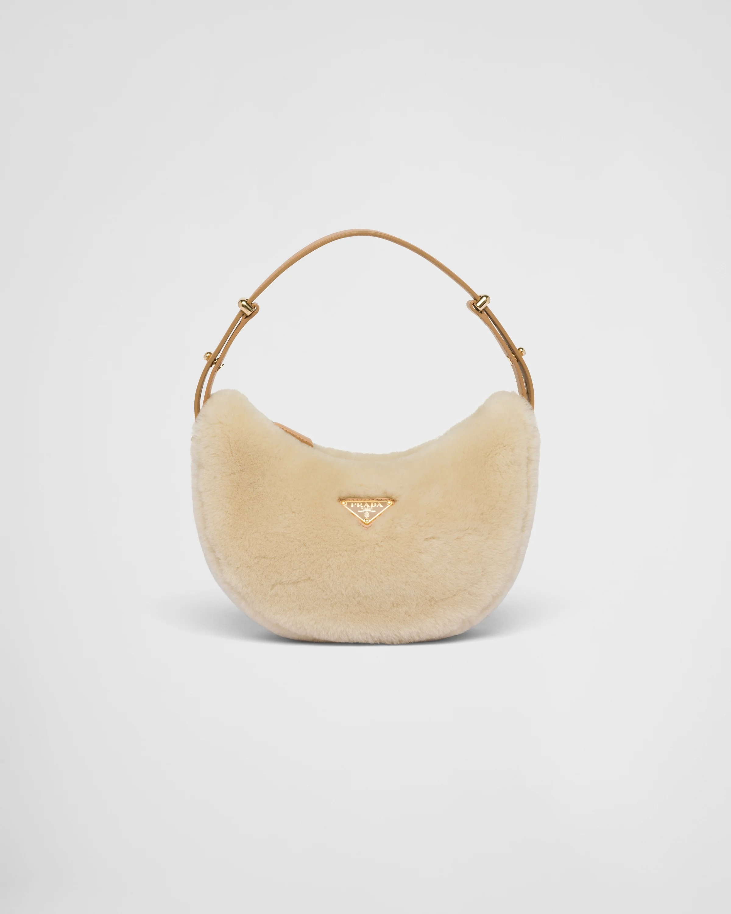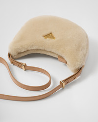 The sinuous silhouette of this bag with modernist allure is enhanced by the soft feel of shearling with wintry allure. The accessory with simple lines and leather details is completed by the handle and removable shoulder strap for versatile wear. The bag with a nappa leather interior and metal hardware is decorated with the iconic enameled metal triangle logo on the front. - Product code: 1BC194_2EC9_F03KL_V_OOO - Detachable, adjustable leather shoulder strap, length: 90 cm. Maximum length 93 cm - Minimum length 83 cm - Maximum drop 60 cm- Minimum drop 55 cm - Metal hardware - Enameled metal triangle logo on the front - Zipper closure - Nappa leather interior with patch pocket - Imported Height: 18.5cm Width: 22.5cm Length: 6cm MATERIALS Main material: Lambskin