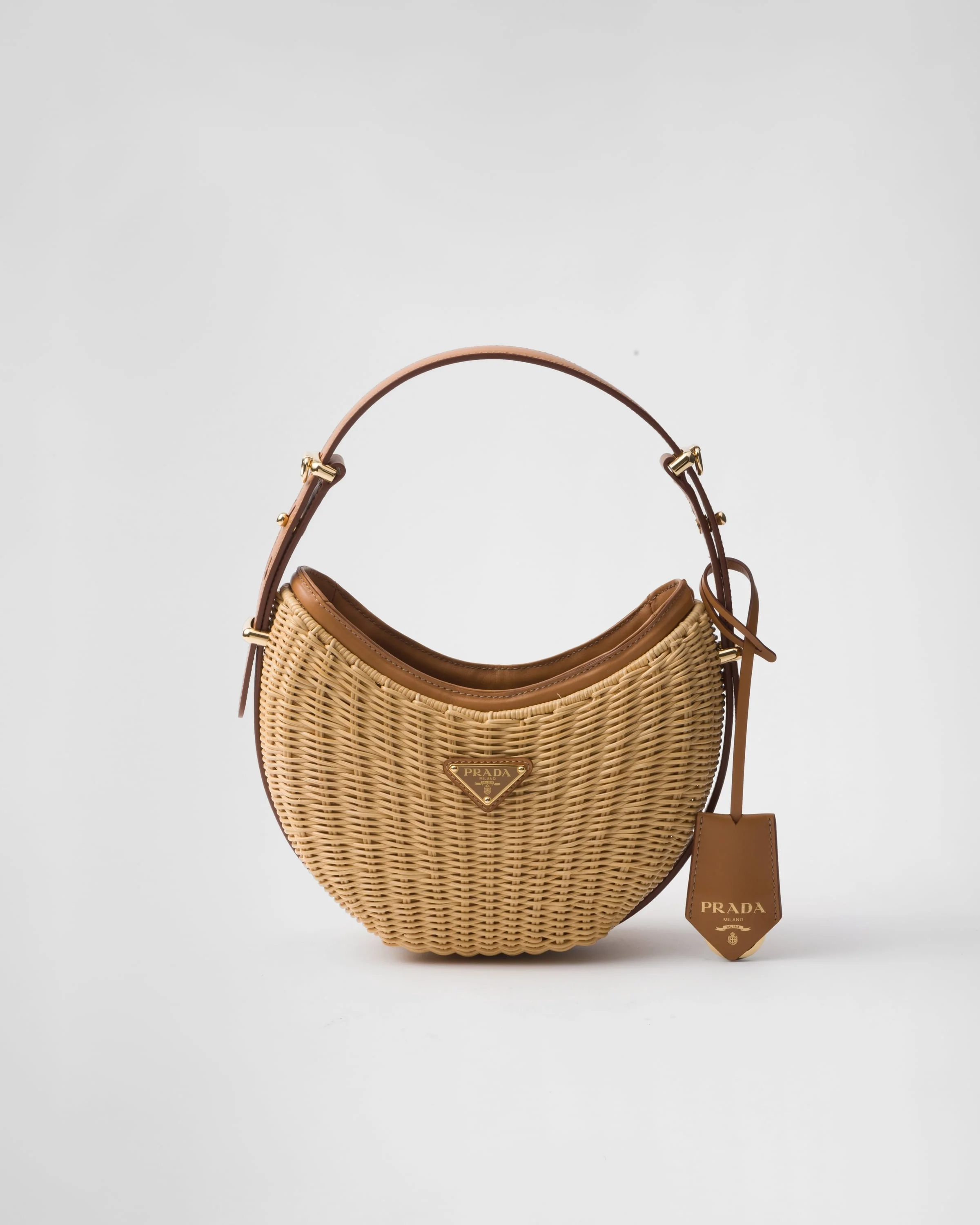 The unique wicker texture adds structure and originality to the curvy, half-moon silhouette of the Prada Arque bag embellished with the iconic triangle logo. Reinterpreted with sophisticated allure that evokes a summery mood, the accessory is accented with leather details like the handle and detachable shoulder strap for versatile wear. - Product code: 1BC202_2CYF_F0018_V_OOO - Detachable, adjustable leather shoulder strap. Maximum length 95 cm - Minimum length 85 cm - Maximum drop 60 cm - Minimum drop 55 cm - Removable leather key ring - Metal hardware - Enameled metal triangle logo on the front - Fabric lining - Imported Height: 18.5cm Width: 22.5cm Length: 6cm MATERIALS Main material: Rattan