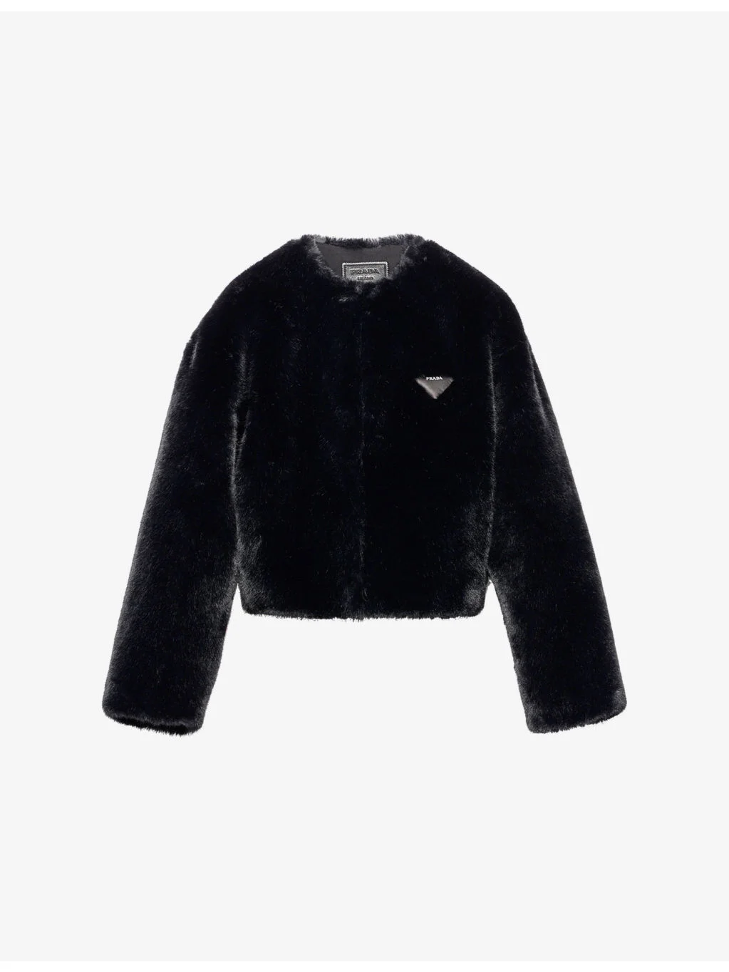 PRODUCT DETAILS - Prada faux fur jacket - 100% polyester - Pressed stud fastening - Regular fit, round neck, long sleeves, triangle logo at chest, cropped - Dry clean only - True to size - Model is 5ft 10in/1.78m and wears a size UK 8 - Midweight, non-stretch Ref: R04434099