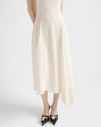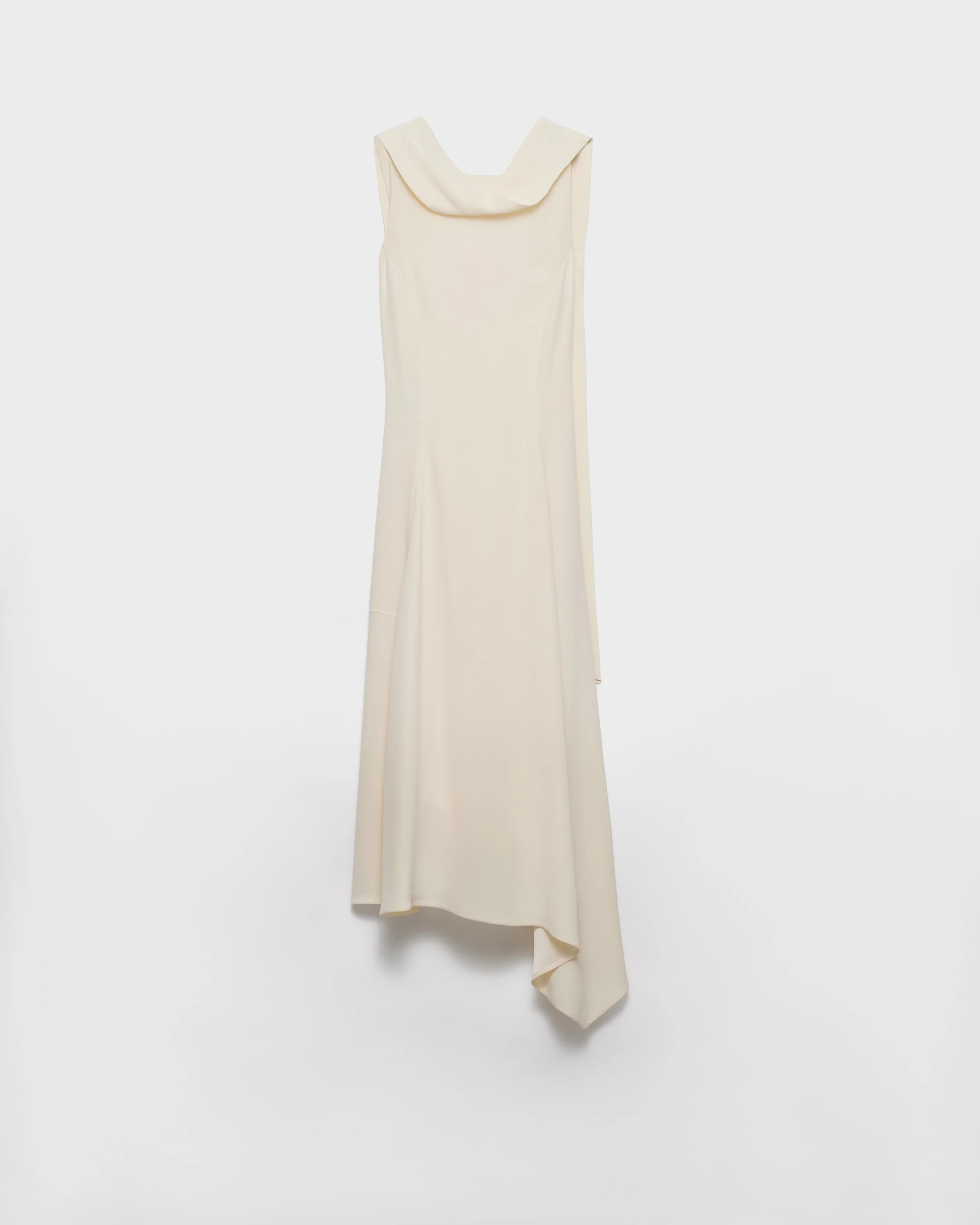 This satin crepe dress with a light, sophisticated design combines contemporary lines and details with vintage charm. The soft, asymmetrical silhouette is defined by the sophisticated low back. - Product code: P3P85_15VR_F0304_S_OOO - Fit-and-flare - Unlined - Boat neck - Bow on the back - Side zipper closure - Sleeveless - Asymmetrical hem - Imported - The model is 176 cm tall and wears a size 38 Height: 120cm MATERIALS Main material: 100% viscose