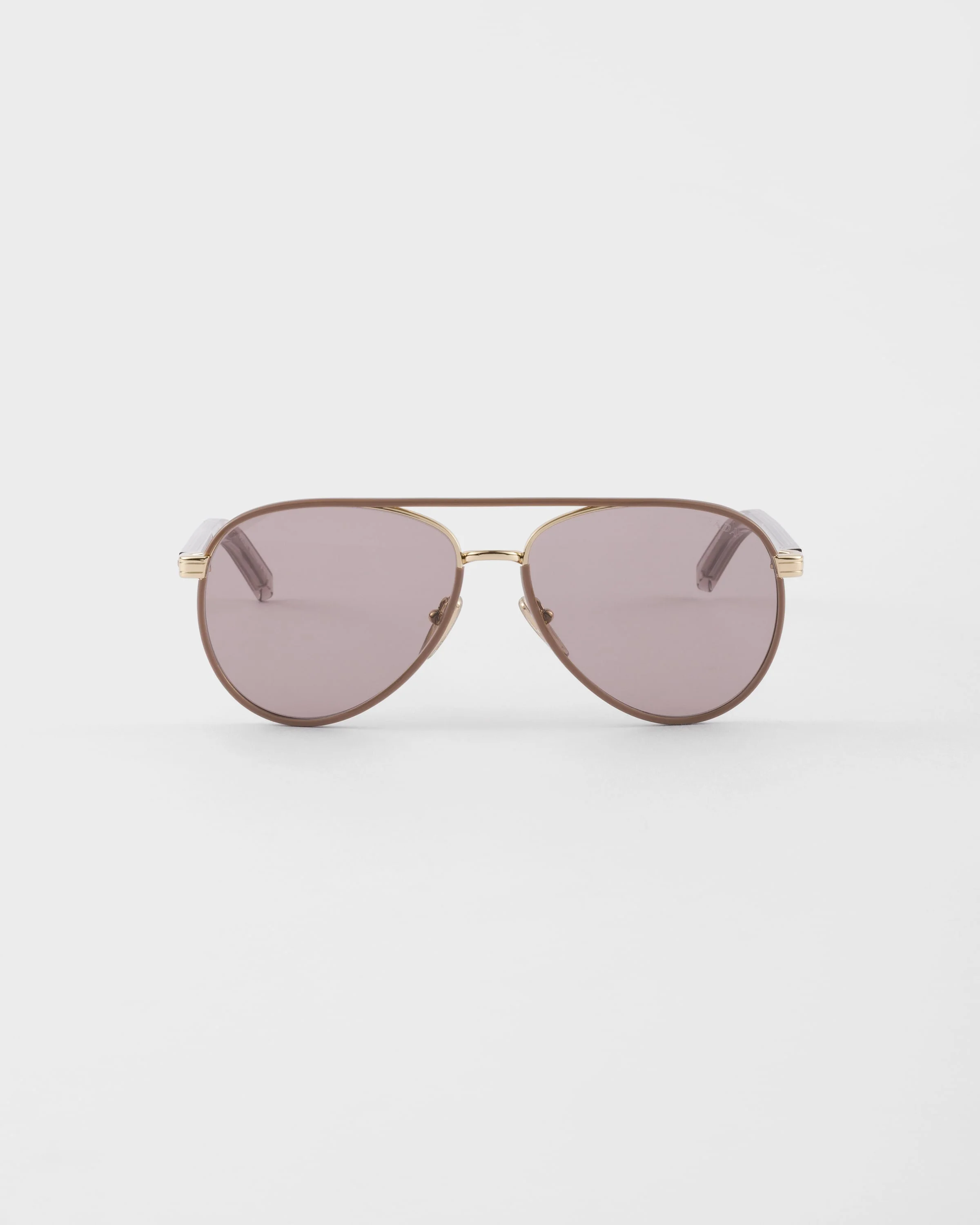 Sleek lines and refined details give these new Prada sunglasses a sense of contemporary elegance. The metal aviator frame front has teardrop lenses enhanced by colored acetate rims. The slim temples are enriched by the metal plaque with the Prada lettering logo. - Product code: SPRB57_E24E_FE20I_C_059 - Metal frame front - Color: Pecan & Pale Gold - Frame compatible with graduated lenses - 100% UVA / UVB protection - Adjustable nose pads suitable for any fit - Lens-nose-temple measurement: 59-15-145 mm - Article comes with dedicated packaging - Other colors available - Imported MATERIALS Metal