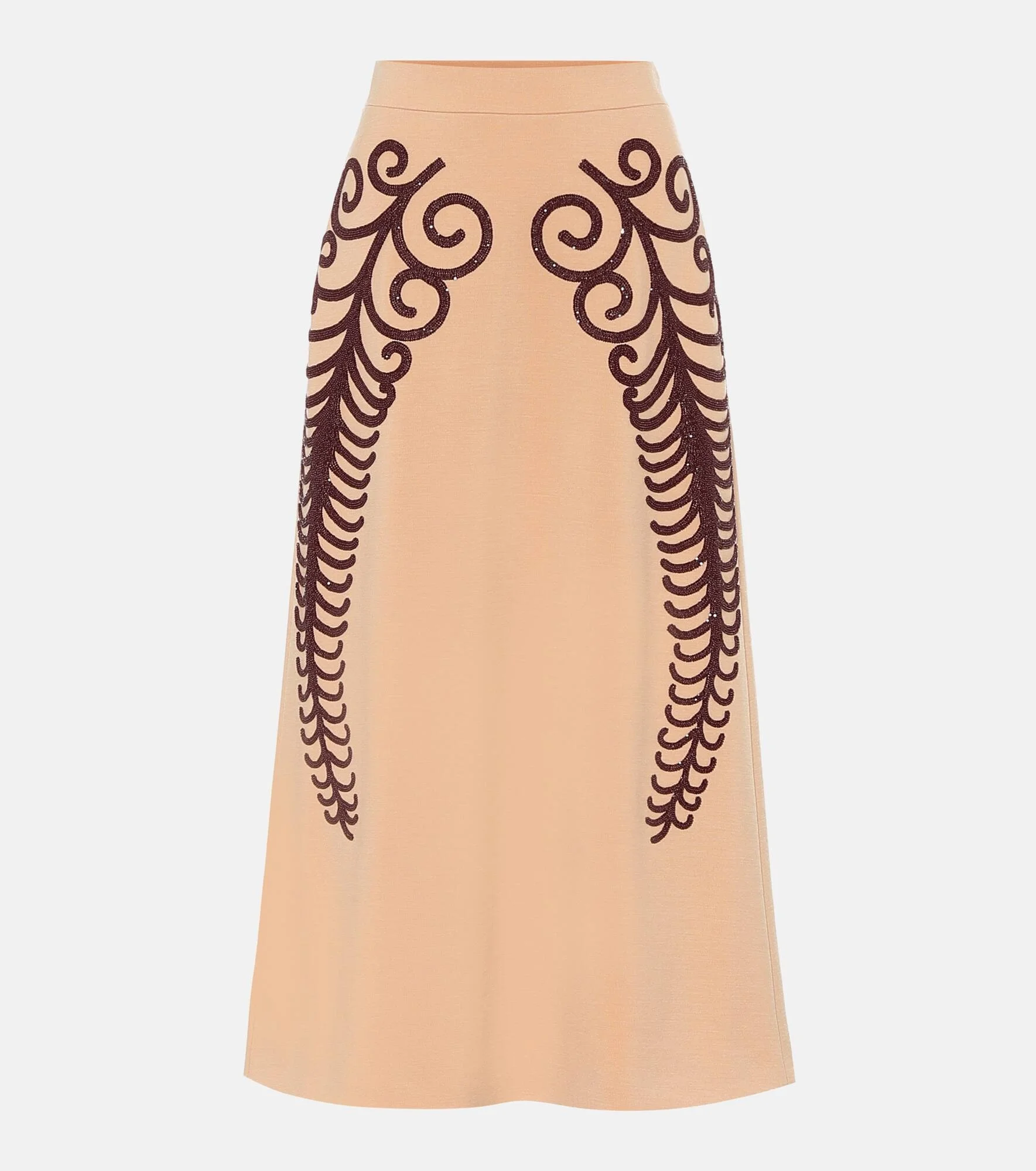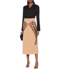 Prada's SS20 offering is a wearable and unapologetically elegant collection, with designs like this embellished pencil skirt. Made from beige wool in a Punto Stoffa knit, it sits high on the waist with a bias-cut silhouette and is finished with hand-embroidered beading in a swirling feather motif. Product Details - Lining: 93% cupro, 7% elastane, fully lined - Trim: 100% glass - Made in Italy - Designer color name: Cammeo+Marrone - Closure: zipper, hook fastening - Material: 100% wool - Care instructions: dry clean - Item number: P00461455 Size & Fit - Fits large to size - we recommend trying one size smaller - High-waisted - The model seen in the picture is 178cm-5'10" and wearing a size IT 40