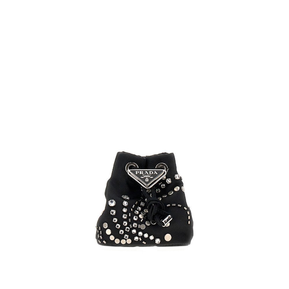 Mini pouch made from Re-Nylon regenerated nylon, enriched with crystals and studs embroidery on front. Drawstring closure and stopper with signature enameled metal triangle logo. Detachable and adjustable leather shoulder strap. Nylon lining. DETAILS Height: 10 cm Depth: 6 cm Width: 8 cm Codice Modello: 1NR016 Stagione: SS24 Materiale: 100% NY Made in: Italy Sku: 11549 Brand: PRADA