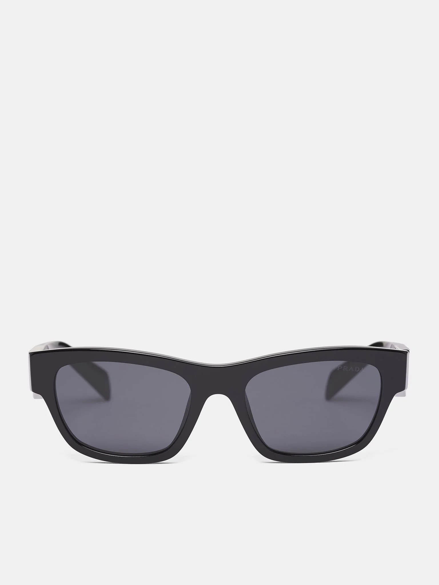 Prada black sunglasses in glossy acetate with rectangular frames and gray-tinted nylon lenses, finished with logo and geometric temple detailing. Featuring: • One size fit • Rectangular frame design • Glossy acetate construction • Prada logo and geometric detailing at temples • Gray-tinted nylon lenses • Fixed nosepads • Case included • Imported • Acetate and polyamide