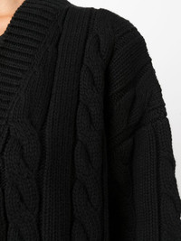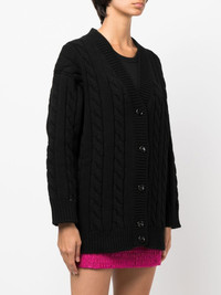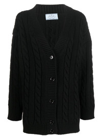 V-neck cable-knit cardigan Made from a blend of virgin wool and cashmere, this cardigan from Prada is defined by its textured cable-knit construction. It is designed with drop shoulders for a relaxed feel. Composition Virgin Wool 70%, Cashmere 30% SIZE & FIT Model measurements Height 5 ft 11 in(1.8 m) Bust/Chest 31.49 in(80 cm) Hips 35.43 in(90 cm) Waist 24.4 in(62 cm) FittingInformation This piece fits true to size. We recommend you get your regular size Cut for a loose fit Made with a mid-weight fabric