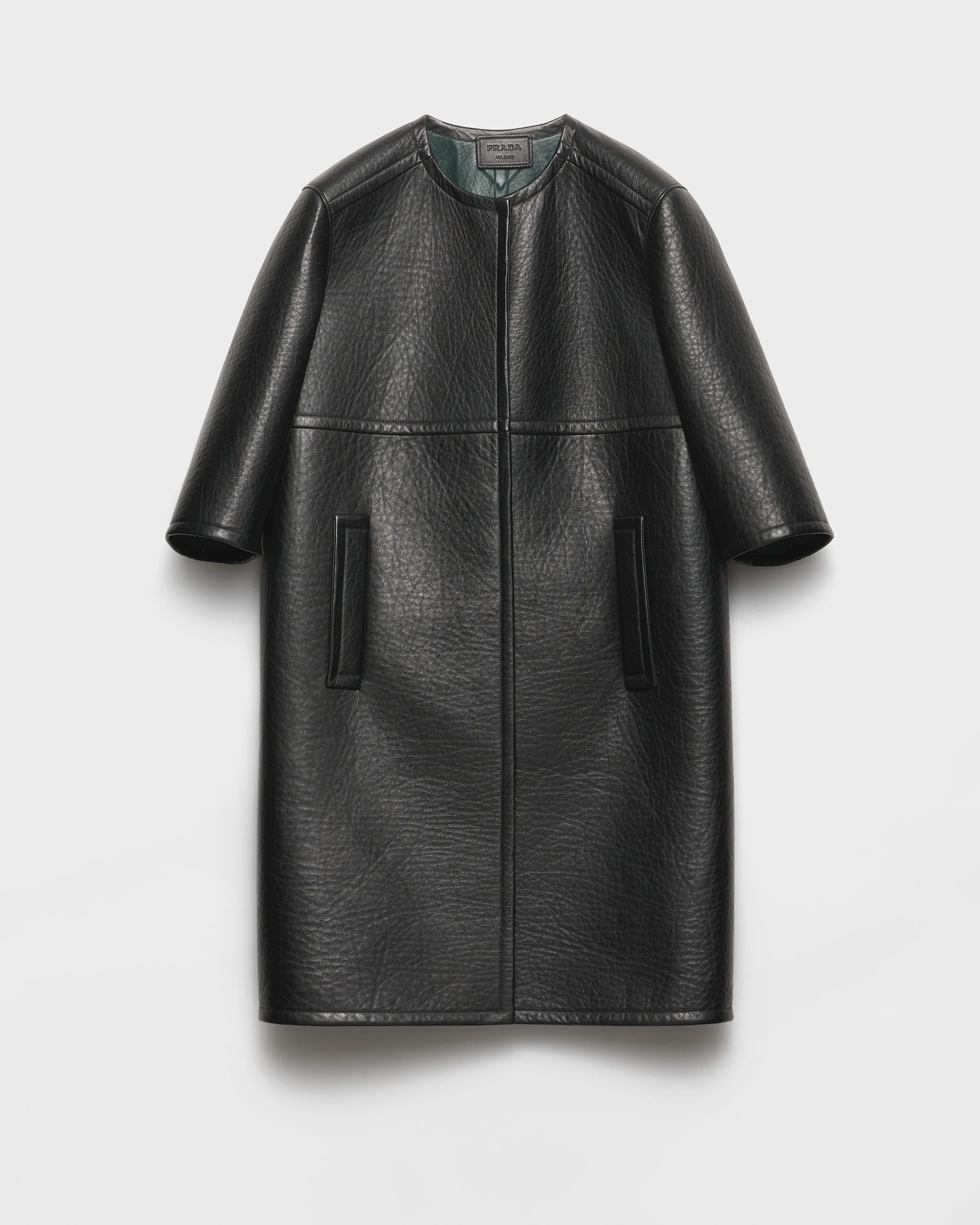 This structured and lightweight bonded leather coat is unlined and combines a rigorous design and softness. Sleek lines and the triangle logo on the back express a strong, contemporary vision. - Product code: 56A193_172H_F0E8U_S_OOO - Unlined - Regular fit - Center closure - Three-quarter sleeves - Wide welt pockets - Leather triangle logo on the back - Imported - The model is 180 cm tall and wears a size 38 Height: 100cm MATERIALS Main material: Goatskin