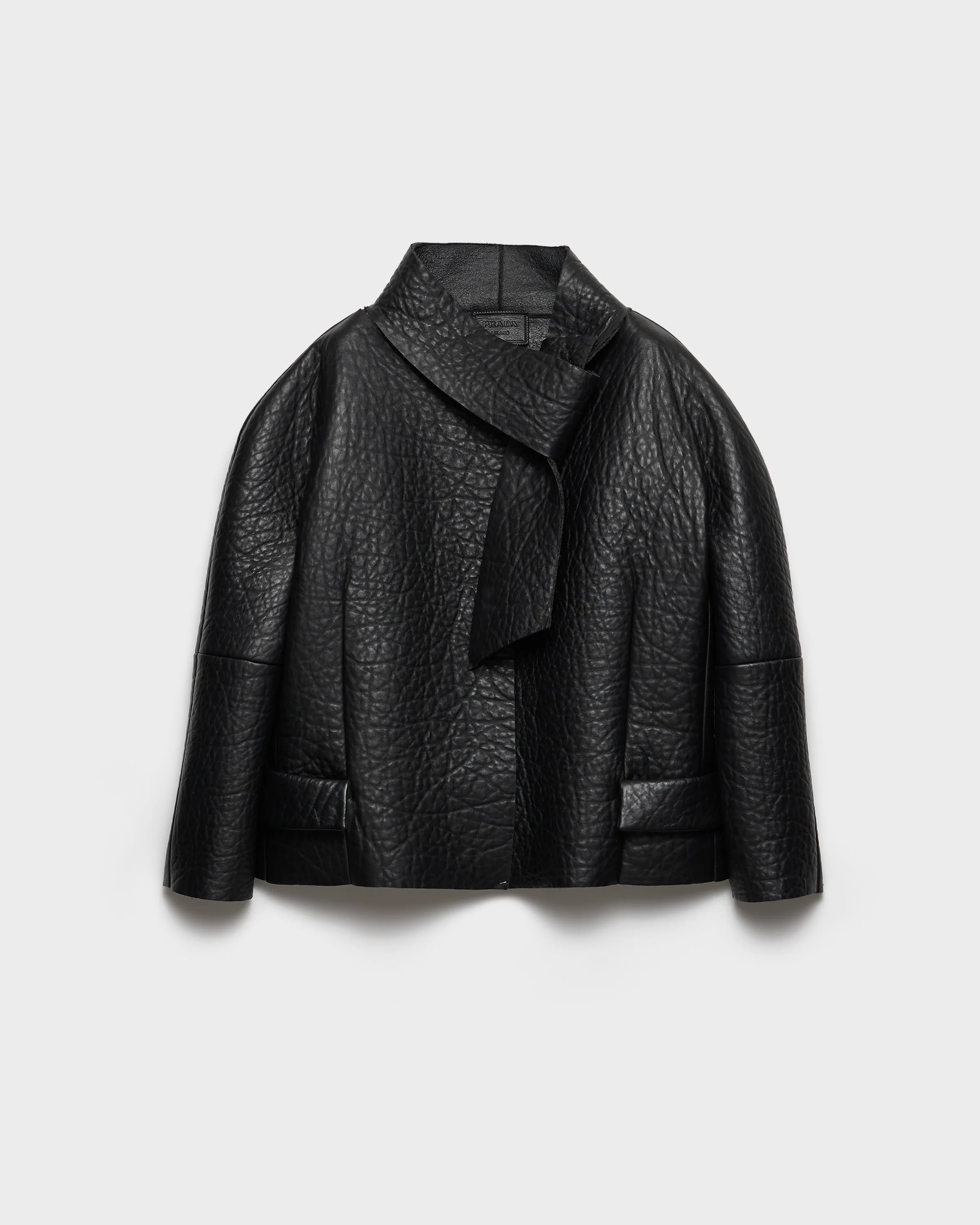 The sleek, modernist design of this jacket is embellished with refined artisan workmanship that gives the nappa leather a unique, rich texture with an irregular grain. Clean lines and vintage details define the style, completed with an elegant scarf collar. - Product code: 55857_18A7_F0002_S_OOO - Unlined - Oversized fit - Front button closure - Kimono sleeves - Flap pockets - Scarf collar - Imported - The model is 178 cm tall and wears a size 38 Height: 60cm MATERIALS Main material: Lambskin