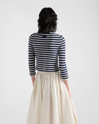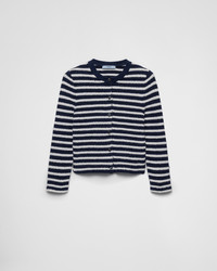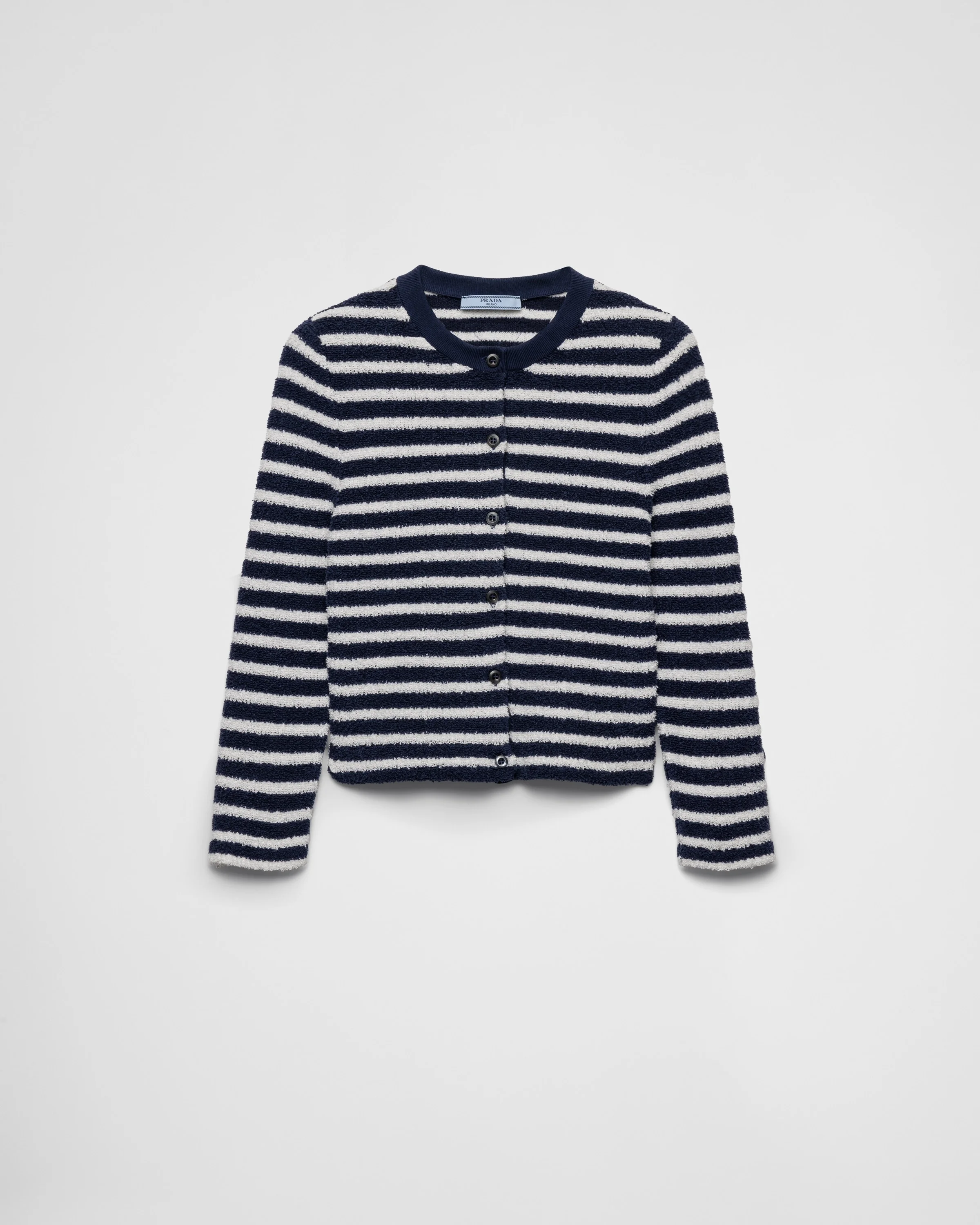 This cotton boucle cardigan is characterized by its fresh texture and a contrasting stripe motif recalling the nautical world. - Product code: P25N49_16VI_F056H_S_OOO - Long sleeves - Striped motif - Slim fit - Ribbed knit crew neck - Regular shoulder - Knit triangle logo - Front button closure - Imported - The model is 180 cm tall and wears a size 38 Height: 48cm MATERIALS Main material: 65% cotton 35% polyamide