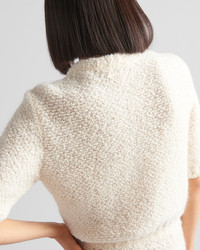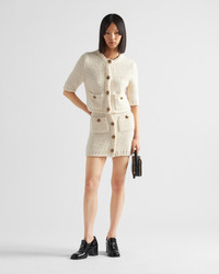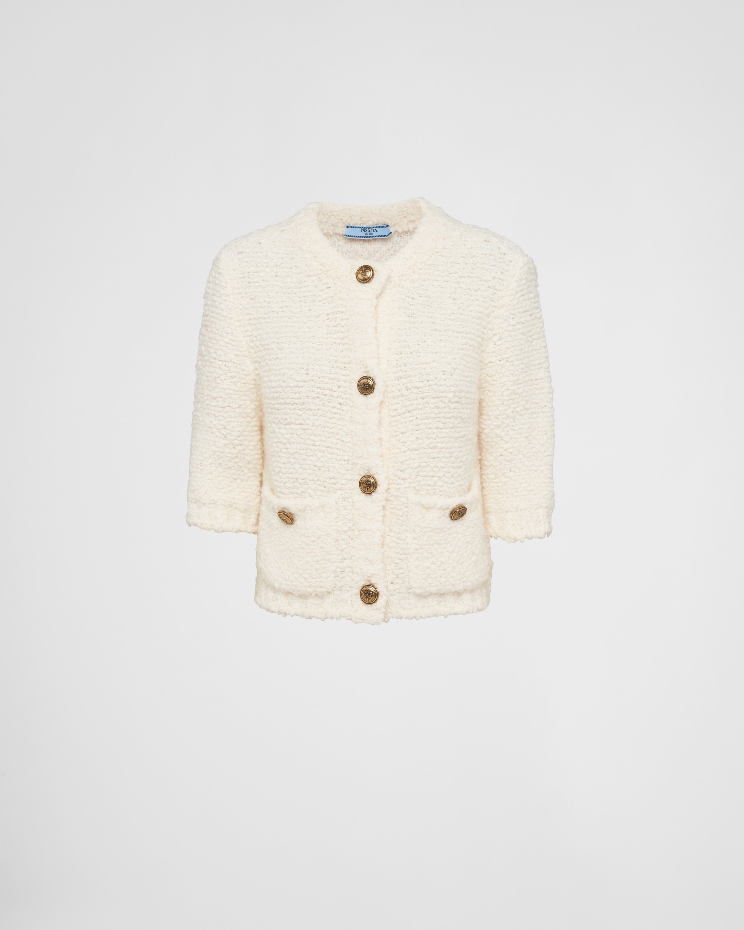 Boxy lines reinterpret the sophisticated silhouette of this boucle mohair cardigan, giving it contemporary allure. The crew-neck design, defined by three-quarter sleeves, features shiny retro-style gold-tone buttons. The fabric triangle logo on the back decorates the elegant and versatile garment with its iconic touch. - Product code: P25L98_13CS_F0009_S_232 - Three-quarter sleeves - Vanise knit - Boxy fit - Ribbed knit crew neck - Regular shoulder - Ribbed knit sleeve trim and hem - Front button closure - Patch pockets - Imported - The model is 177 cm tall and wears a size 38 Height: 43cm MATERIALS Wool