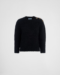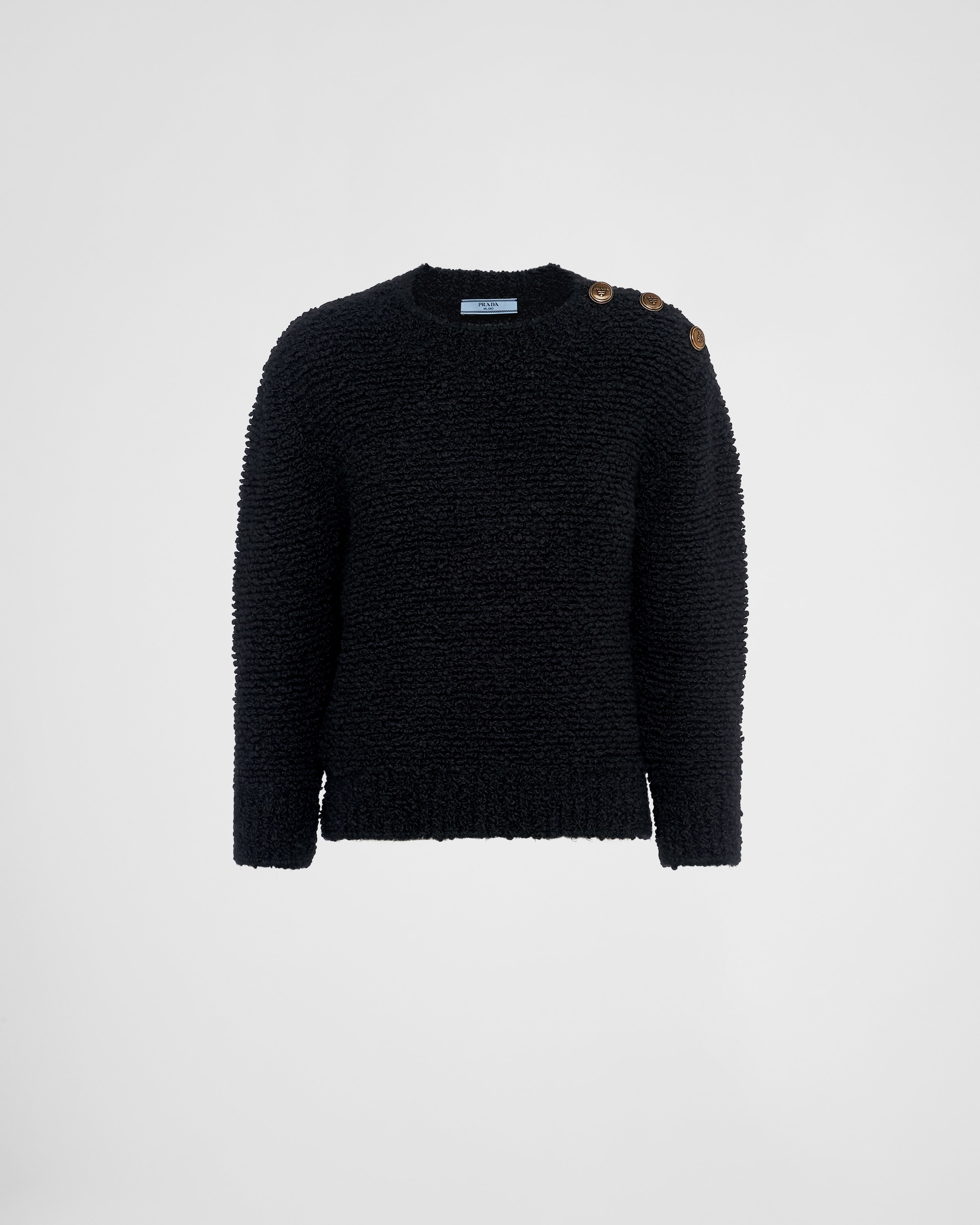 This sweater with three-quarter sleeves made of fine boucle mohair has sophisticated, modern allure. Boxy lines define the simple yet refined silhouette, accented with shiny buttons on the shoulder. The garment is decorated with a tonal triangle logo on the back. - 商品货号: P24A2A_13CS_F0002_S_231 - Three-quarter sleeve - Vanise knit - Boxy fit - Ribbed knit crew neck - Regular shoulder - Ribbed knit cuffs and hem - Triangle logo - Back button closure - 产品标签信息 - The model is 179 cm tall and wears a size 38 高度: 45cm MATERIALS Wool