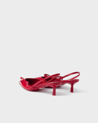 These slingback pumps with precise and feminine tapered lines embody pure, contemporary elegance. The patent leather shoes have a tapered and light pointy toe silhouette embellished with a simple yet refined bow. The geometric kitten heel, inspired by the emblematic Prada triangle, completes the sophisticated design. - Product code: 1I454O_069_F0011_F_B045 - Screen-printed logo - Leather sole with rubber heel tip and metal lettering logo - Varnished heel, height 45 mm - Imported MATERIALS Main material: Calfskin