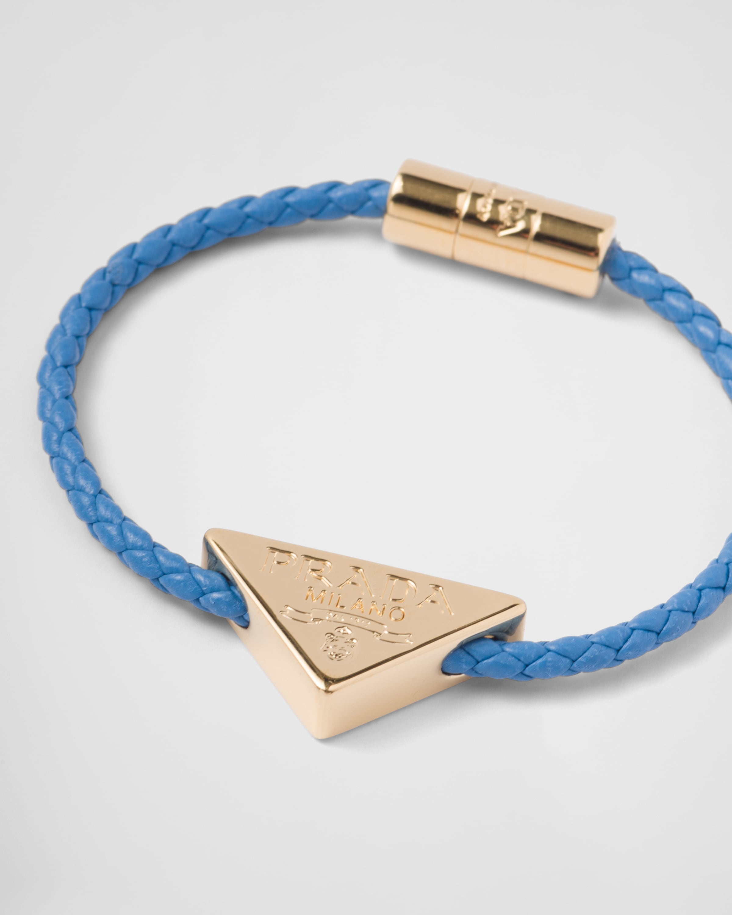 The sophisticated braided motif animates this nappa leather bracelet with metal barrel screw clasp. The metal triangle logo charm stands out. - 제품 코드: 1IB350_038_F0V98 - Metal barrel screw clasp on the back - Metal triangle logo charm - Imported
