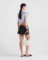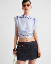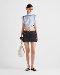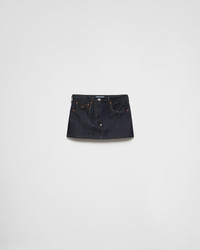 This miniskirt made of high-quality denim with a raw finish has a contemporary design. Contrasting stitching defines the flared, low-rise style, which features an archive Prada logo printed on the label, and the iconic enameled-metal triangle logo. - 商品品番: GFD179_15C8_F0008_S_OOO - Raw treatment - Unlined - Low-rise waist - Button closing - Contrasting topstitching - Center-back length: 30 cm; Size: 38 - Triangle logo - Rounded pockets with front ticket pocket - Back patch pockets - Strap with buckle at the back - Prada Milano logo label on the back - インポート - The model is 178 cm tall and wears a size 38 - 高さ: 30cm