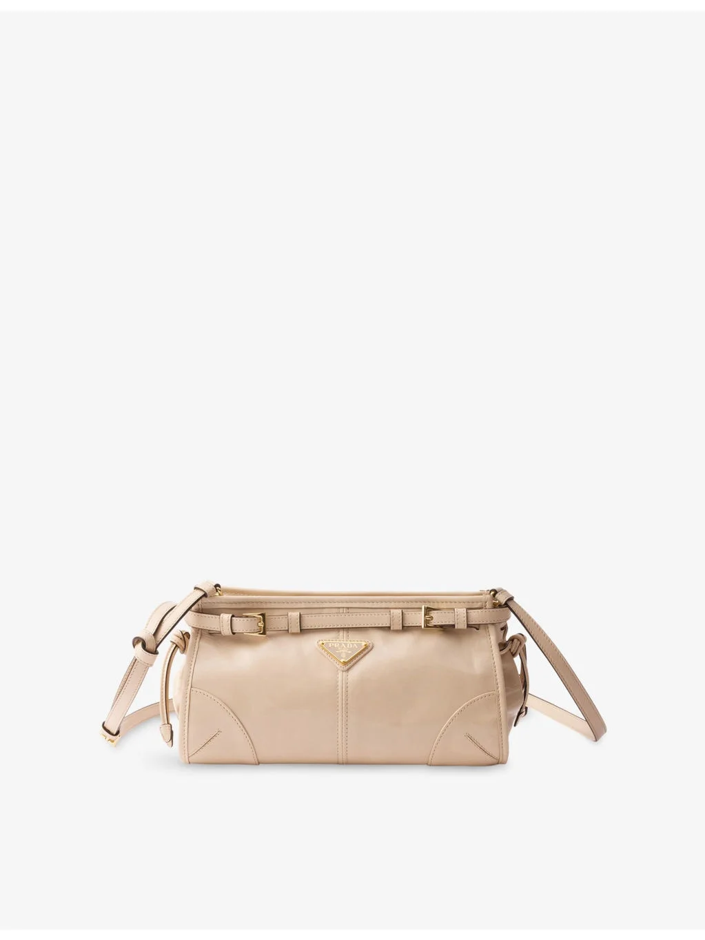 PRODUCT DETAILS - Prada leather shoulder bag - 100% leather - Zip fastening - Detachable, adjustable shoulder strap, shoulder pad to the strap, rectangular silhouette with buckled strap to the top, enamelled metal triangle brand plaque to the front, gold-toned hardware, one main interior compartment, interior central zipped pocket, interior patch pocket, leather and logo-print nylon lining - Height 14cm, width 26cm, length 12cm - Specialist leather clean - Made in Italy Ref: R04373125