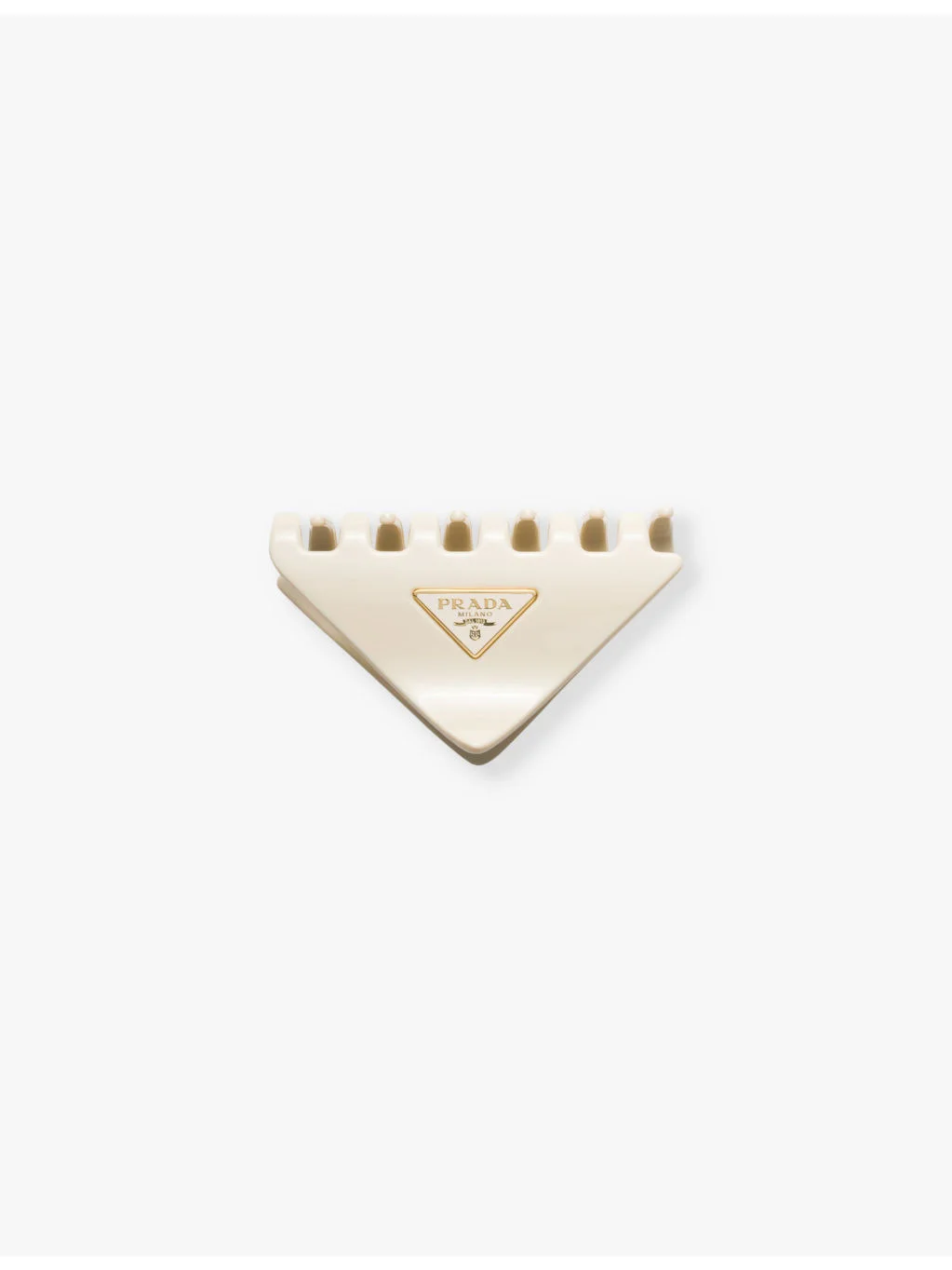 PRODUCT DETAILS - Prada acrylic claw clip - 100% acrylic plastic; 100% brass - Claw design, triangle shape, enamelled metal triangle brand plaque to the side - Height 5.2cm, width 8.5cm - Wipe with a clean, dry cloth - Made in Italy Ref: R04373251