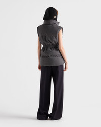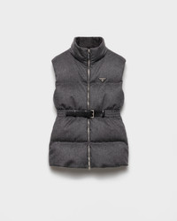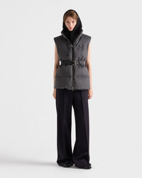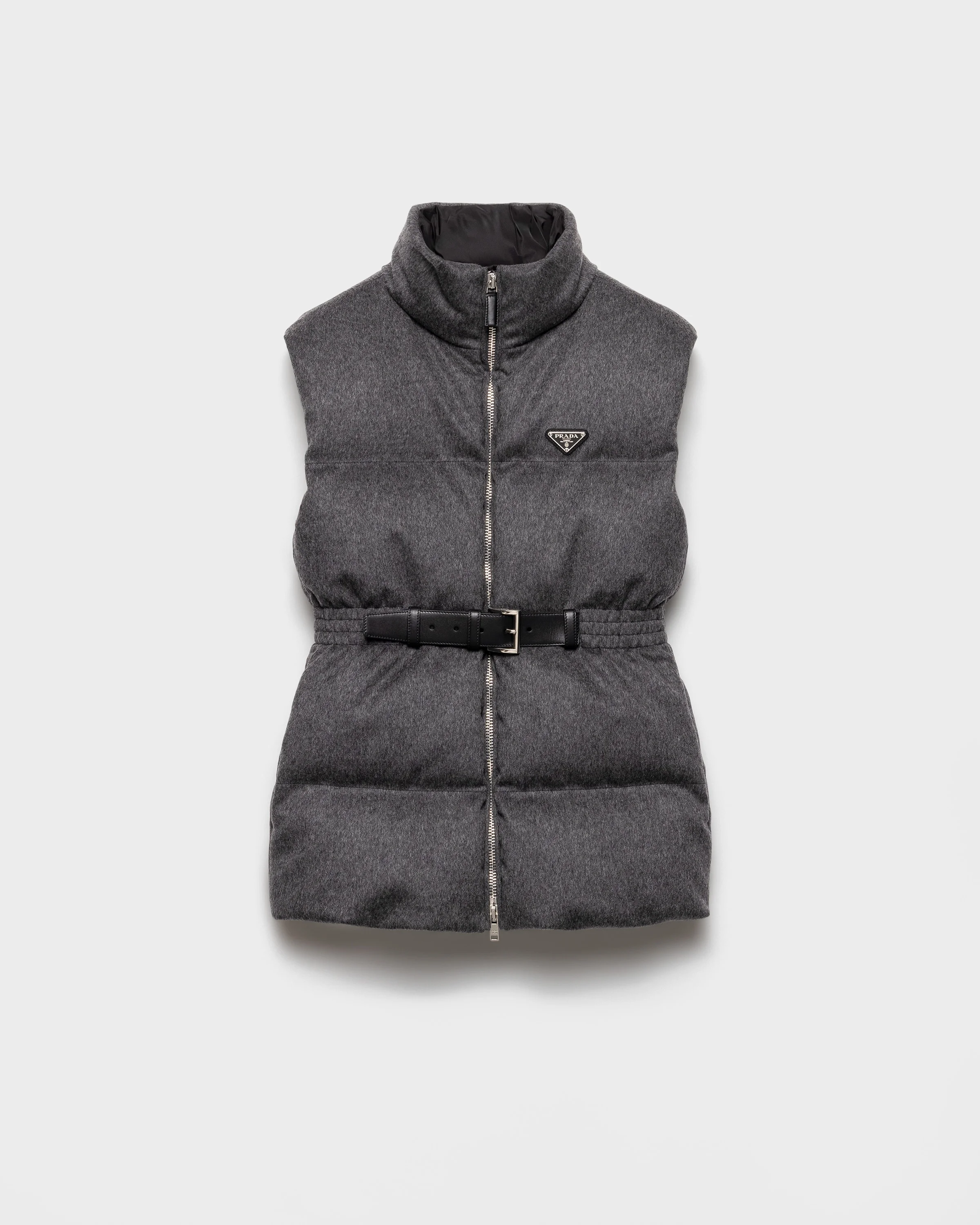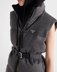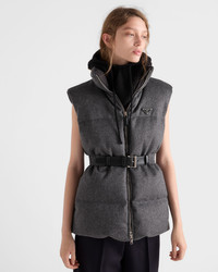 A sophisticated combination of materials enriches this loden vest with goose down padding. The garment combines a sporty silhouette with a relaxed fit and sophisticated notes like the leather belt that defines the vest with soft volumes. - Product code: 29S131_C2O_F0480_S_OOO - Relaxed fit - The garment fits up to one size larger - Goose down padding - Stand-up collar - Zipper closure - Fabric triangle logo - Internal pocket with button - Leather belt - Lined garment - Elasticized waist - Inseam pockets - Imported - The model is 180 cm tall and wears a size 38 Height: 68cm MATERIALS Main material: 100% virgin wool
