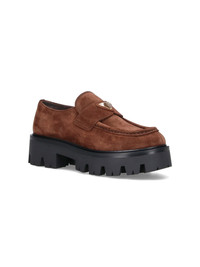 PRADA BROWN SUEDE LOAFERS WITH ROUND TOE, TOP BAND, TRIANGLE LOGO IN ENAMELED METAL ON THE TOP, EMBOSSED STITCHING, LOGO ENGRAVED ON THE SOLE, RUBBER SOLE. PRODUCT INFO PRODUCT CODE 1D185O 050 103F0324 COMPOSITION: 100% CALF LEATHER SIZE AND FIT: HEEL HEIGHT 5.5 CM - SOLE: 100% RUBBER