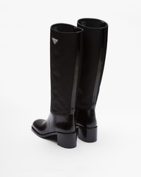 A harmonious contrast of iconic Prada materials defines the design of these heeled boots. The elegance of brushed leather and the comfort of Re-Nylon meet in a modern design that combines sophistication and freedom of movement. This product does not contribute to the SEA BEYOND educational program. - Product code: 1W411M_3LFU_F0002_F_D055 - Enameled metal triangle logo - 39 cm boot leg - Leather and rubber monobloc sole with hot-stamped logo - 55 mm heel - Imported MATERIALS Main material: Calfskin