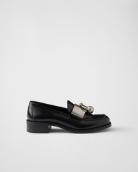 Refined craftsmanship, bold details and unexpected touches add character to these loafers with sophisticated lines. The shoes made of brushed fume leather are defined by metal elements that contrast with the classic silhouette. - Product code: 1D981N_P39_F0002_F_D035 - Upper with logo-engraved metal ornament - Monoblock rubber sole with hot-stamped logo - Heel height 35 mm - Imported MATERIALS Main material: Calfskin