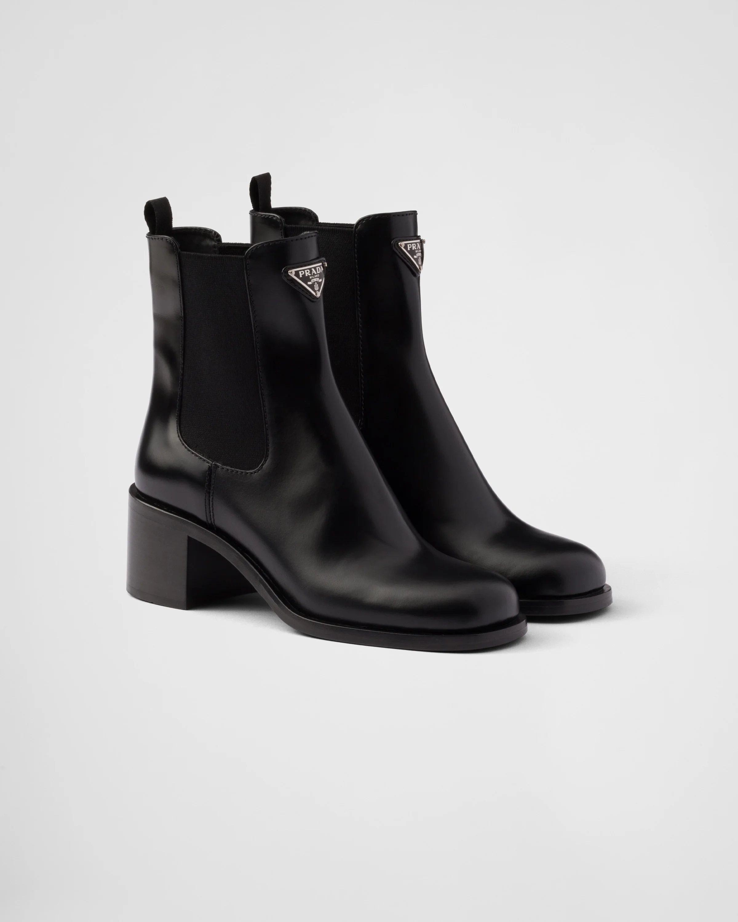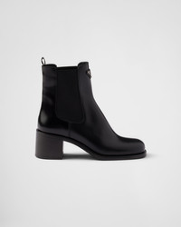 These brushed leather booties have a refined and versatile design with clean lines. The enameled metal triangle logo embellishes the style with its sleek, distinctive signature. - Product code: 1T227N_055_F0002_F_055 - Upper with elasticized side gusset and pull tab - Leather lining - Enameled metal triangle logo - Boot leg: 14 cm - Leather and monoblock rubber sole with hot-stamped logo - Heel height 55 mm - Imported MATERIALS Main material: Calfskin