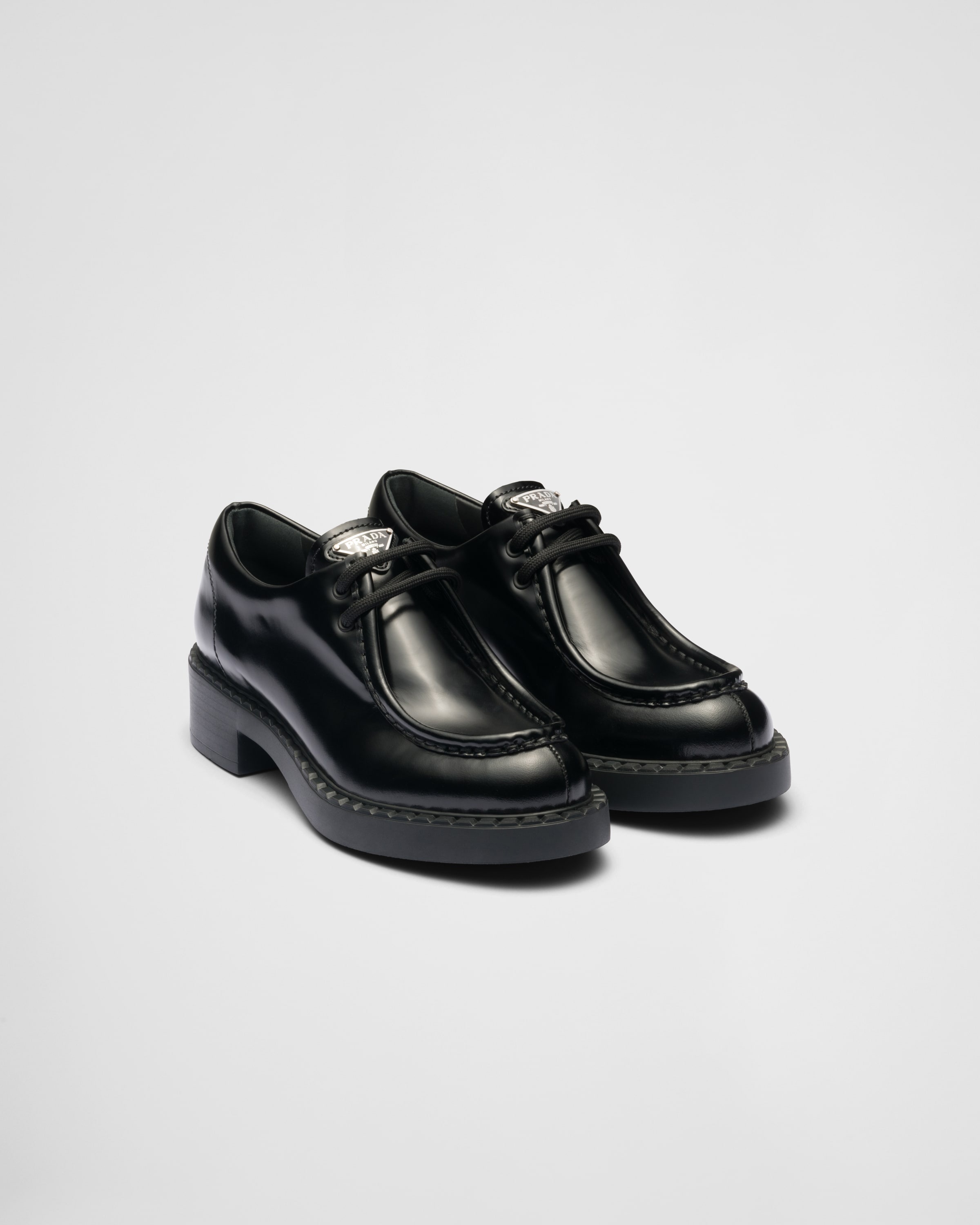 A clean, sleek aesthetic characterizes the contemporary style of these brushed leather lace-ups with a voluminous silhouette. The sinuous construction and metal lettering logo emphasize the personality of the shoe. - Product code: 1E249N_055_F0002_F_B050 - Enameled metal lettering logo - Closure with polyester laces - 50 mm rubber monoblock sole with hot-stamped logo - Rubber welt with notched detail - Imported MATERIALS Leather