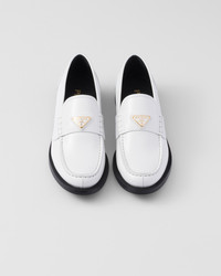 The timeless silhouette of these loafers stands out due to the finely crafted details and refined finish of brushed leather that enriches the design along with the distinctive triangle logo. - Product code: 1D813N_055_F0009_F_A020 - Upper with leather band - Enameled metal triangle logo - Monoblock rubber sole with hot-stamped logo - Heel height, 20 mm - Imported MATERIALS Main material: Calfskin