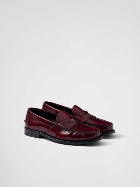 These brushed leather loafers feature a sleek silhouette, blending traditional craftsmanship with modern design. The enameled metal triangle logo subtly embellishes the upper. - Product code: 1D820N_055_F0D27_F_020 - Upper with leather band - Enamelled metal triangle logo - Monoblock rubber sole with hot-stamped logo - Heel height: 20 mm - Imported MATERIALS Main material: Calfskin