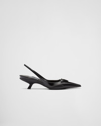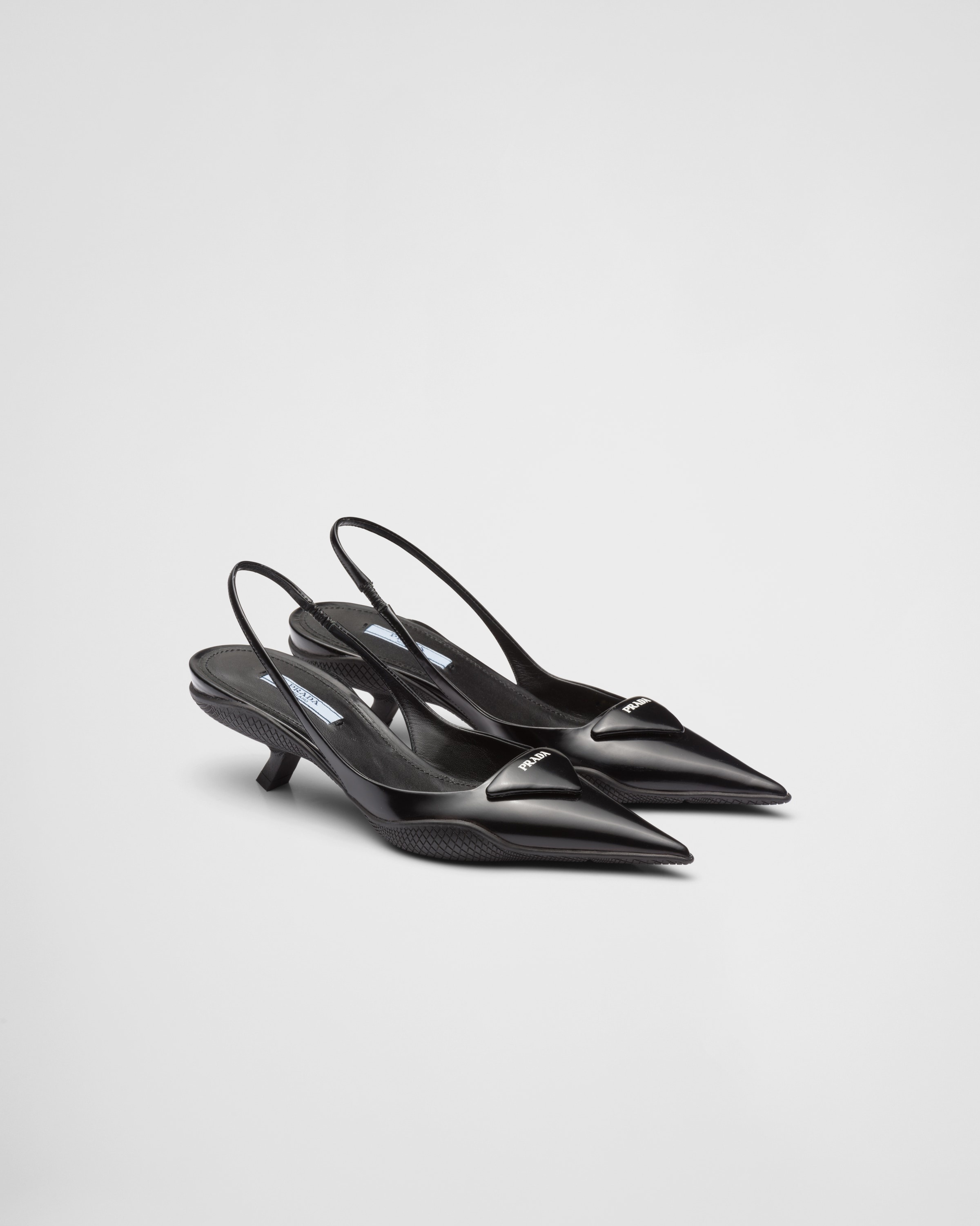 Revisiting a design from the Prada archives of the '90s, the rubber shell sole envelops the upper of these brushed leather slingback pumps, creating a hybrid silhouette that blends a feminine pointy shape and sporty references. A distinctive element of the Spring Summer 2021 collection is the comma heel, inspired by styles from the same decade. New variations arrive for the iconic triangle, which turns into a slightly padded leather detail featuring the screen-printed Prada logo. - Product code: 1I565M_055_F0002_F_A045 - Screen-printed leather triangle logo - Rubber shell sole and tread with optical lens pattern - Imported MATERIALS Leather