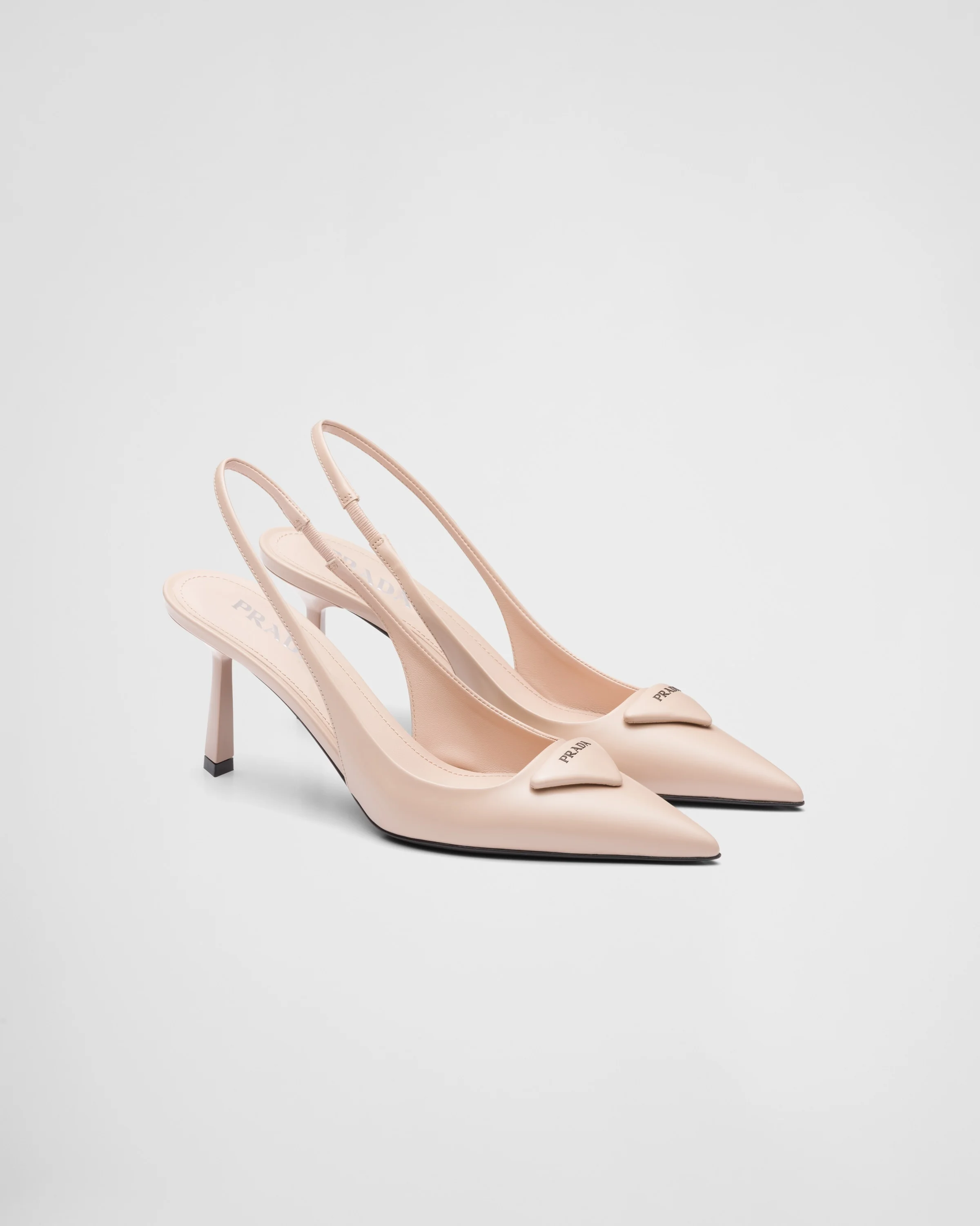 These pumps expressing sophisticated, feminine elegance are made of brushed leather, an emblematic material of Prada since the 90s traditionally used for luxury footwear. The triangle logo returns as a slightly padded leather detail and inspires the geometric line of the heel, which gives the silhouette a modernist note. - Product code: 1I901M_055_F0236_F_DD75 - Screen-printed leather triangle logo - Leather sole with metal lettering logo - 75 mm varnished heel - Imported MATERIALS Main material: Calfskin