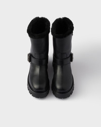 A design with refined lines and artisan construction defines these leather booties with a versatile character. The biker style boot, enriched by a warm shearling lining, is completed with light and durable chunky rubber soles. - Product code: 1U187O_3LPN_F0002_F_ZF50 - Upper with logo-engraved metal buckle - Shearling lining - Enameled metal triangle logo - Boot leg: 19 cm - Monoblock rubber sole, 50 mm, with hot-stamped logo - Lug tread - Imported MATERIALS Main material: Calfskin