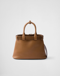 Clean lines and refined elements tell the story of Prada's dual aesthetic that moves between simplicity and detail, functionality and elegance. This leather bag with nappa interior summarizes the stylistic codes of the brand in a pragmatic yet sophisticated design. The silhouette is characterized by a multifaceted soul, expressed by the interchangeable belt that enriches the accessory with a unique and contemporary touch. The lettering logo, embossed in 22 karat gold leaf, decorates the modern, versatile style. - Product code: 1BA434_2CY9_F03BH_V_OBO - Decorative belt with buckle - Leather handles - Detachable, adjustable leather shoulder strap Maximum length 110 cm - Minimum length 100 cm - Maximum drop 55 cm - Minimum drop 50 cm - Metal hardware - Lettering logo embossed on the leather front - Nappa leather interior with center pocket - Imported Height: 23cm Width: 32cm Length: 11cm MATERIALS Main material: Calfskin