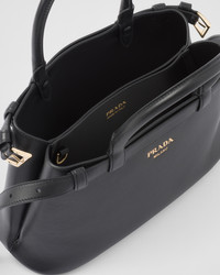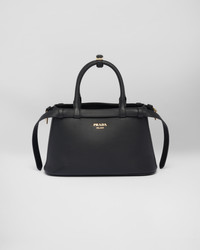 Clean lines and refined elements tell the story of Prada's dual aesthetic that blends simplicity and detail, functionality and elegance. This small leather bag summarizes Prada's stylistic codes in a pragmatic yet sophisticated design, with nappa leather interior characterized by three compartments. The silhouette is animated by the distinctive touch of the leather belts, both refined and modern. The hot-stamped lettering logo in 22 kt gold leaf adds a precious signature to the bag. - Product code: 1BA418_2CYS_F0002_V_OOO - Decorative straps with buckles - Leather handles - Detachable, adjustable leather shoulder strap Maximum length 110 cm - Minimum length 100 cm - Maximum drop 55 cm - Minimum drop 50 cm - Metal hardware - Lettering logo printed on the front - Nappa interior with center pocket - Imported Height: 18cm Width: 28cm Length: 10.5cm MATERIALS Main material: Calfskin