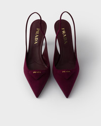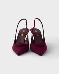 These pointy toe suede slingback pumps with contemporary allure embody refined, feminine elegance. The iconic shape of the triangle logo, reinterpreted with a three-dimensional suede ornament, embellishes the upper and inspires the geometric lines of the heel. - Product code: 1I901M_008_F0007_F_DD75 - Screen-printed leather triangle logo - Leather sole with rubber heel layer and metal lettering logo - Leather-covered heel, height 75 mm - Imported MATERIALS Main material: Goatskin