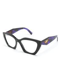 butterfly-frame glasses Highlights - Black/purple - Acetate - Butterfly frame - Clear lenses - Logo-engraved arm - Sculpted arms with curved tips - These glasses come with a protective case. - All glasses from farfetch are sold as non-prescription frames. Composition Outer: Acetate 100% SIZE & FIT Measurement Arm Length 5.51 in(14 cm) Bridge Width 0.7 in(1.8 cm) Lens Diameter 2.12 in(5.4 cm)