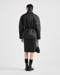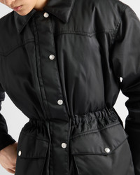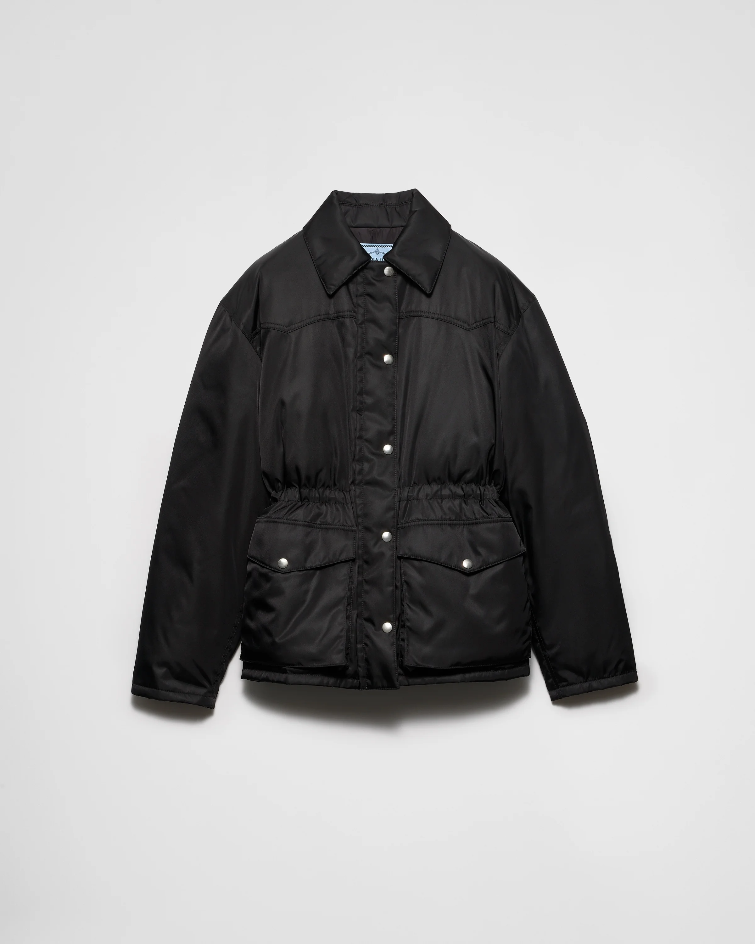 Soft, enveloping volumes create the silhouette of this Re-Nylon down jacket, a hybrid design blending functionality and contemporary elegance. For sustainable care to preserve the product's characteristics and reduce microfiber shedding, we recommend not washing the item too often. Let the product air out after every use and have it dry cleaned at a specialized ecological dry cleaners. - Codigo de producto: 29C182_1WQ8_F0002_S_OOO - Goose down padding - Shirt-style collar - Long sleeves - Straight cuff - Zipper and snap closure - Drawstring at the waist - Enameled metal triangle logo - Flapped patch pockets with snap - Pointed yoke motif on the front and back - Lined garment - The fabric is made of regenerated yarn obtained from recycled plastic materials collected in the ocean - Comfortable regular fit, the garment fits up to one size larger - Importado - The model is 178 cm tall and wears a size 38 Altura: 70cm MATERIALS Nylon