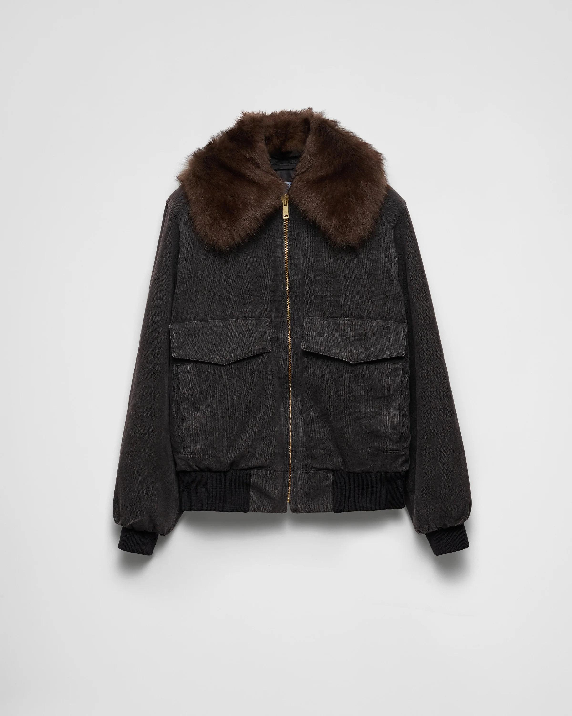 Contrasting styles define this canvas blouson jacket made with artisan techniques for an aged effect with vintage charm. The casual silhouette with utility details is completed by the soft, voluminous collar that completes the look with a refined, contemporary touch. - Product code: 292242_157N_F0002_S_OOO - Long sleeves - Ribbed knit cuffs - Zipper closure - Fabric collar - Flapped welt pockets on the front - Matching stitching - Dyed and treated canvas garment - Triangle logo - Garment length: 66 cm, size: 38 - Imported - The model is 178 cm tall and wears a size 38 Height: 68cm MATERIALS Main material: 100% cotton