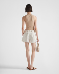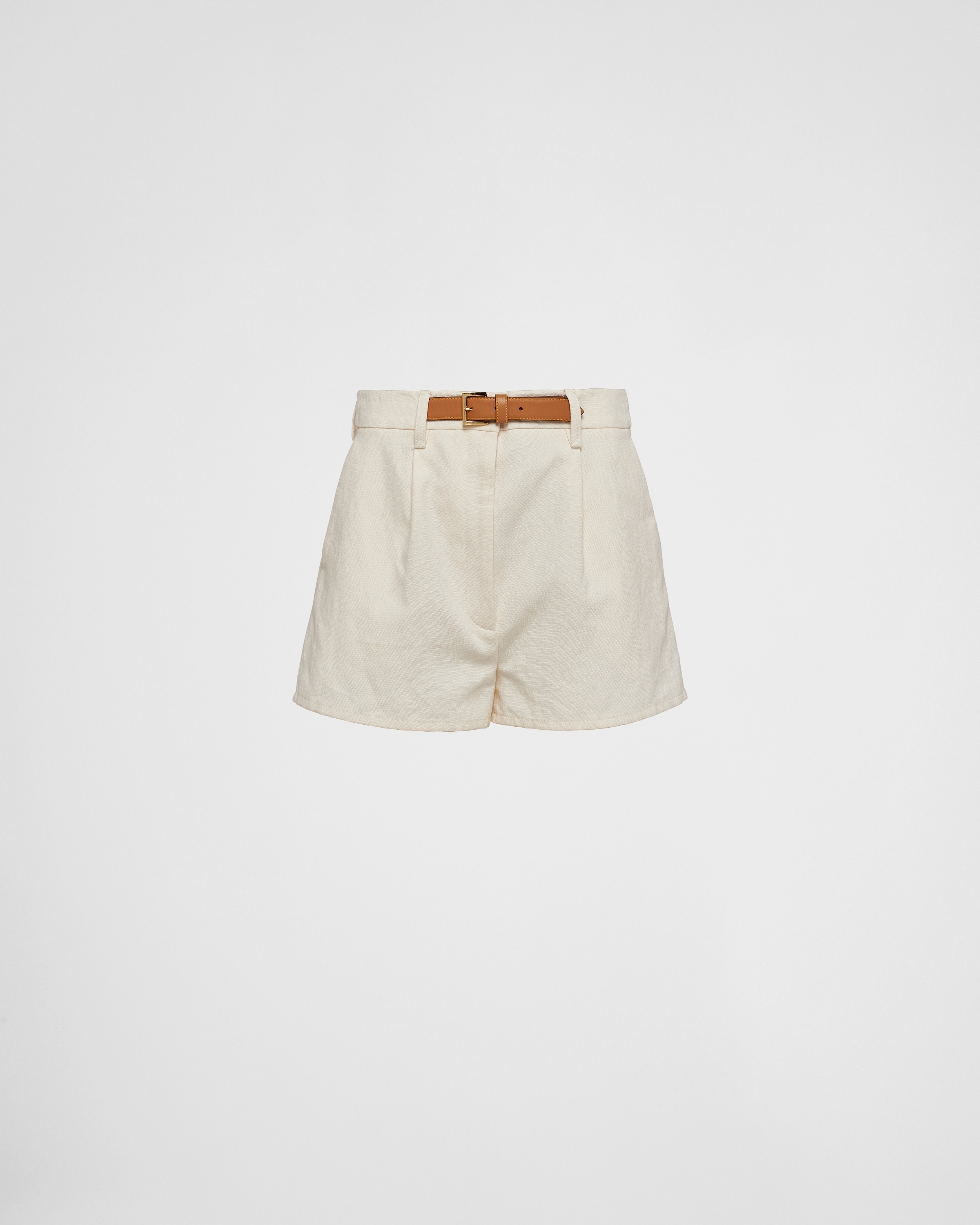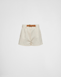 These canvas shorts with a light, casual design inspired by summer are enhanced with refined details. The style with a classic silhouette is enriched with a contrasting leather belt detail decorated with the iconic enameled metal triangle logo. - Product code: P276HE_14GF_F0018_S_OOO - Zipper fly with hook - Angled front pockets and back welt pockets - Leather belt detail with logo - Imported - The model is 180 cm tall and wears a size 38 MATERIALS Cotton