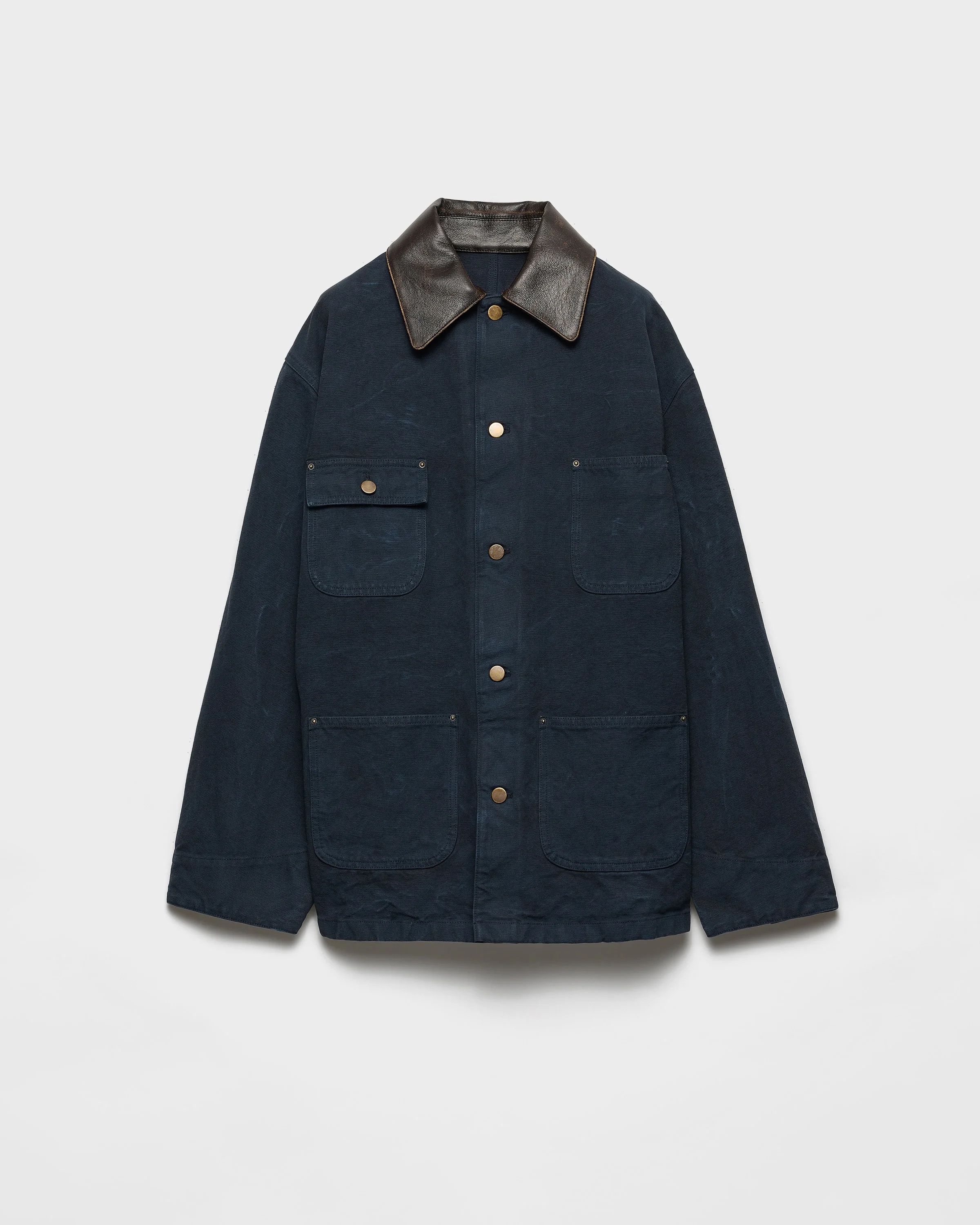 This canvas work jacket, the perfect synthesis of functionality and refinement, is a key piece in the Prada wardrobe. The design reinterprets a workwear classic with a vintage finish created using artisan processes that give dimension to the pragmatic fabric. The oversized silhouette is completed by the leather collar that reveals the refined essence of the style decorated with the triangle logo. - Product code: 29L181_157N_F0008_S_OOO - Unlined - Leather collar - Long sleeves - Button closure - Leather triangle logo - Sleeve hem with buttonhole and two buttons - Patch pockets on the chest, including one with flap - Low patch pockets - Matching stitching - Garment made of dyed and treated canvas - Total length 77 cm, Size: 38 - Imported - The model is 180 cm tall and wears a size 38 Height: 77cm MATERIALS Main material: 100% cotton