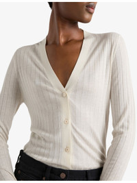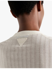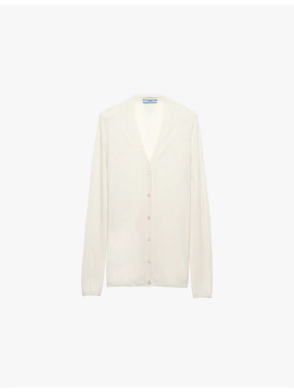 The essential sophistication of this cardigan is created by the combination of masculine-inspired classic lines and minimalist details. Made of cashmere and silk, the fine style is embellished by ribbing, while the fabric triangle logo completes it with a sophisticated touch. - Product code: P25M94_15HX_F0032_S_OOO - Long sleeves - Ribbed knit - Slim fit - Raglan sleeves - Ribbed cuffs and hem - Knitted triangle logo - Front button closure - Imported - The model is 180 cm tall and wears a size 38