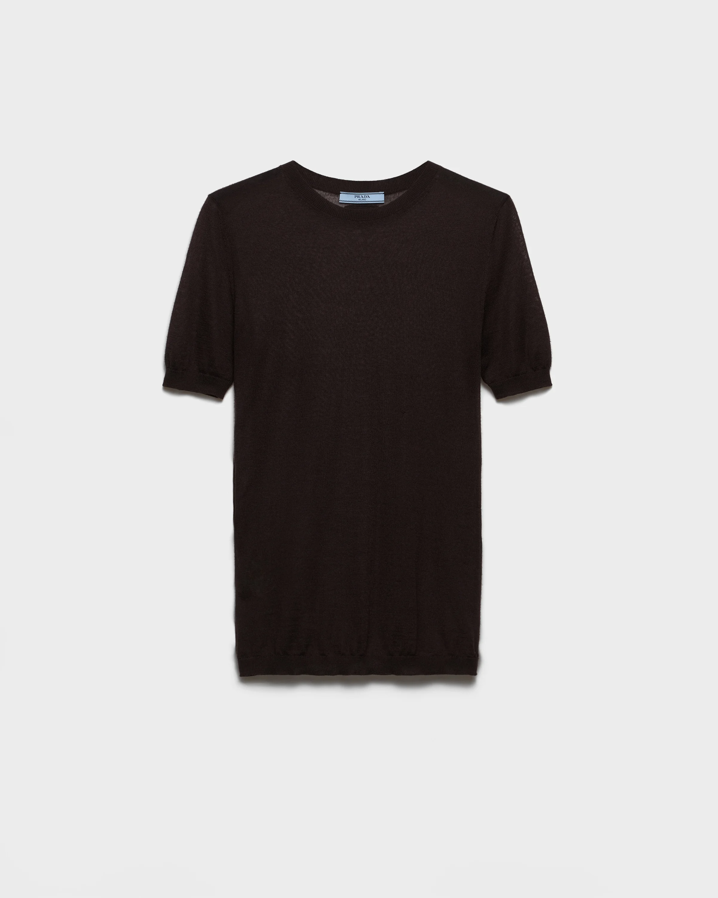 This light and sophisticated crew-neck sweater is made of a fine wool and silk blend yarn. The refined, versatile garment with sleek elegance is perfect for layered looks with contemporary allure. - Product code: P24U2V_18DN_F0003_S_OOO - Short sleeves - Plain knit - Boxy fit - Ribbed knit crew neck - Semi-raglan shoulder - Ribbed knit sleeve trim and hem - Triangle logo - Imported - The model is 180 cm tall and wears a size 38 Height: 64cm MATERIALS Main material: 30% Silk 70% Cashmere
