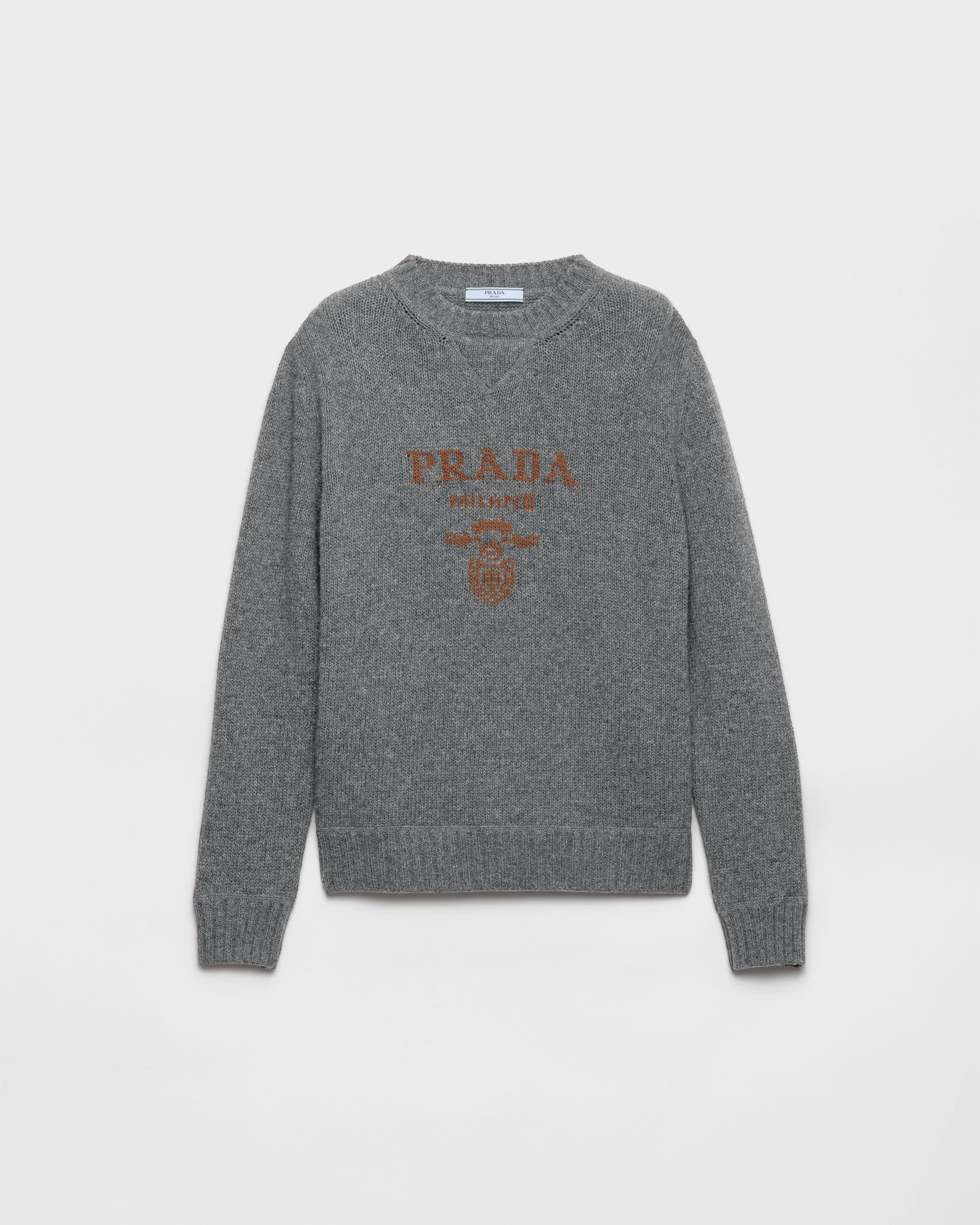 The Prada logo is presented as an intarsia that decorates this wool and cashmere crew-neck sweater. The sleek, iconic garment has a menswear fit and ribbed knit trim. - Product code: P24G1V_1YMW_F0AGC_S_232 - Cashmere and wool - Intarsia Prada logo - Menswear fit - Ribbed knit trim - Raglan sleeves - Imported - The model is 180 cm tall and wears a size 38 Height: 60cm MATERIALS Main material: 30% cashmere 70% virgin wool