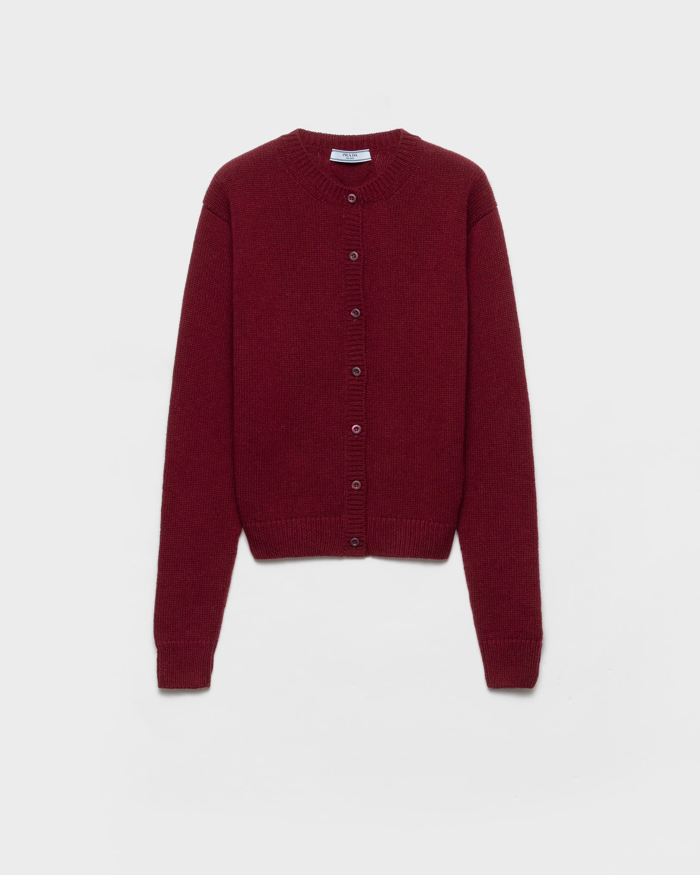 This soft cashmere cardigan features a classic boxy silhouette completed with sleek details such as the emblematic tonal knit triangle logo. - Product code: P25N17_1521_F0399_S_OOO - Long sleeves - Plain knit - Boxy fit - Ribbed knit crew neck - Semi-raglan shoulder - Ribbed knit cuffs and hem - Knit triangle logo - Front button closure - Imported Height: 55cm MATERIALS Main material: 100% cashmere