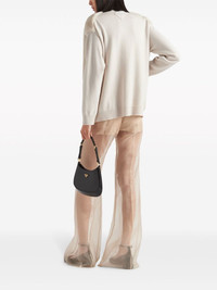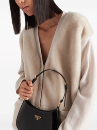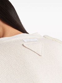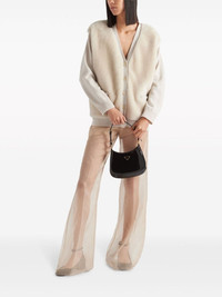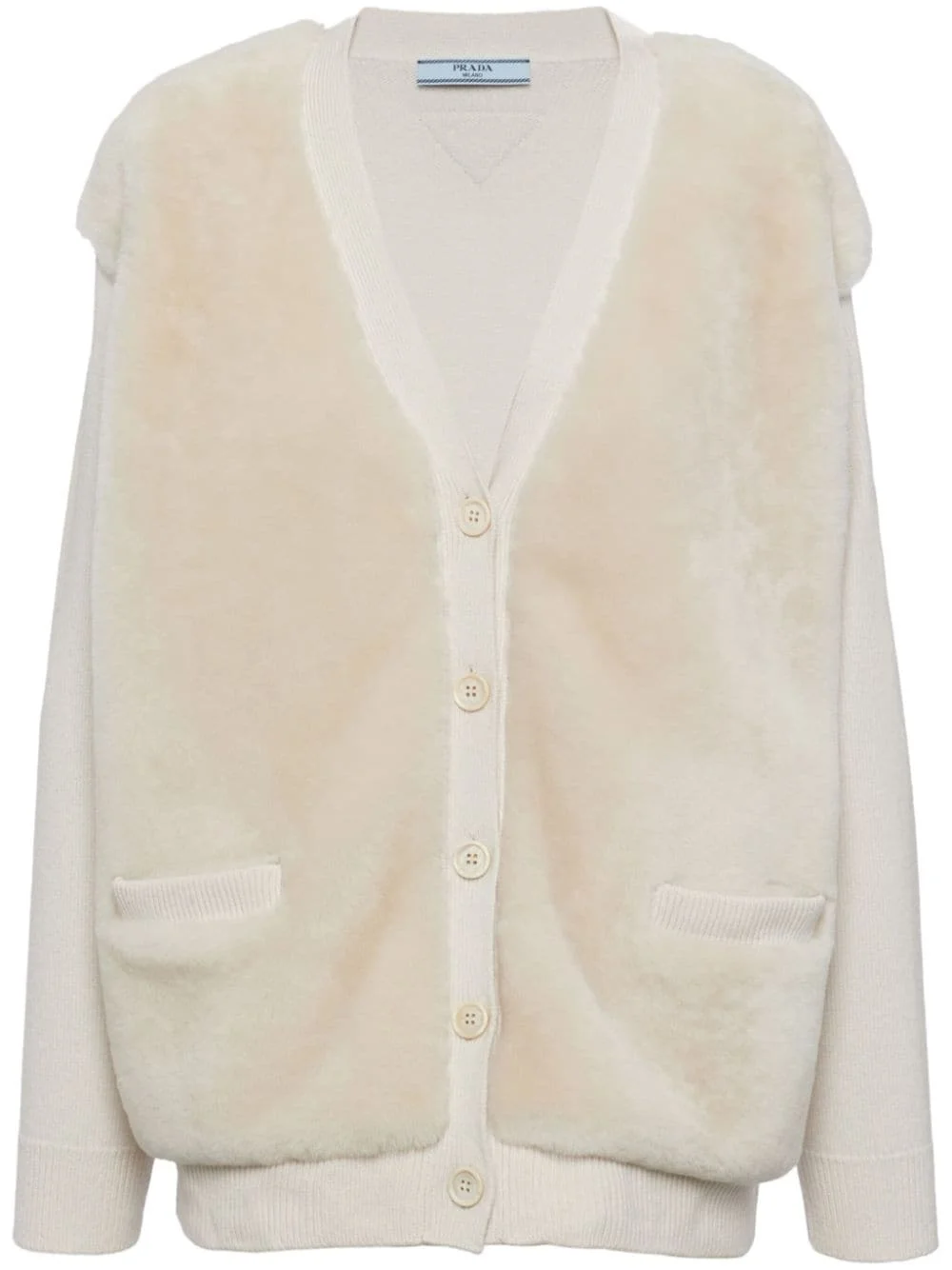 shearling-panel cashmere cardigan Highlights - White - Cashmere - Shearling panelling - Triangle logo - Ribbed trim - V-neck - Front button fastening - Long sleeves - Two front welt pockets - Straight hem Composition Sheep Skin/Shearling 100%, Cashmere 100%