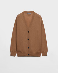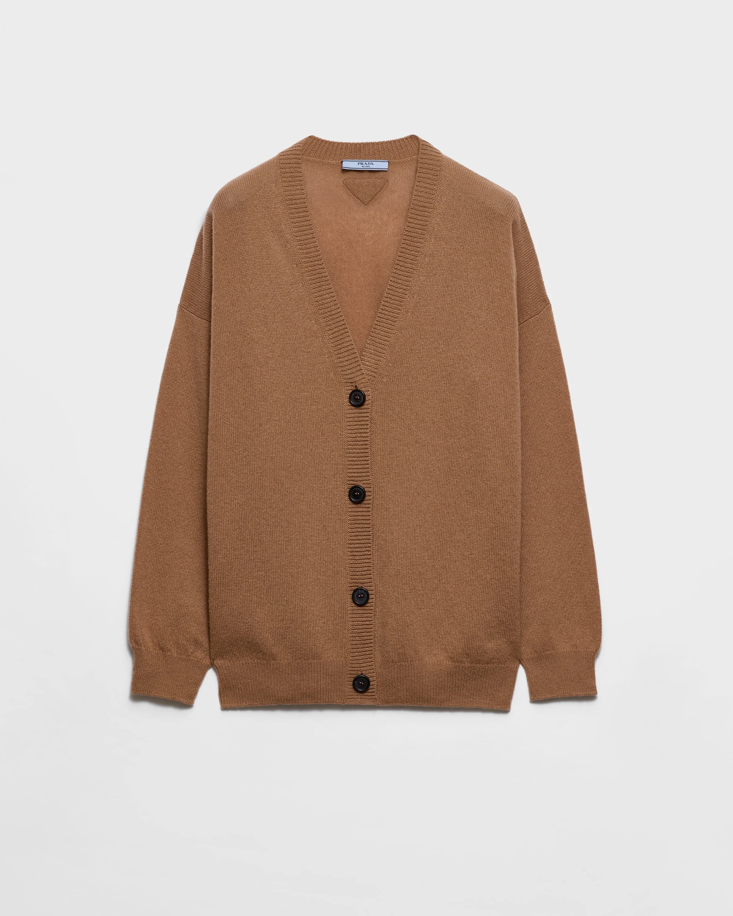 This cashmere cardigan is a timeless classic that is perfect for easy everyday wear. - Product code: P25N67_16A5_F0040_S_OOO - Long sleeves - Plain knit - Oversized fit - Ribbed knit V-neck - Semi-raglan shoulder - Ribbed knit cuffs and hem - Knit triangle logo - Front button closure - Imported - The model is 178 cm tall and wears a size 38 Height: 66cm MATERIALS Main material: 100% cashmere